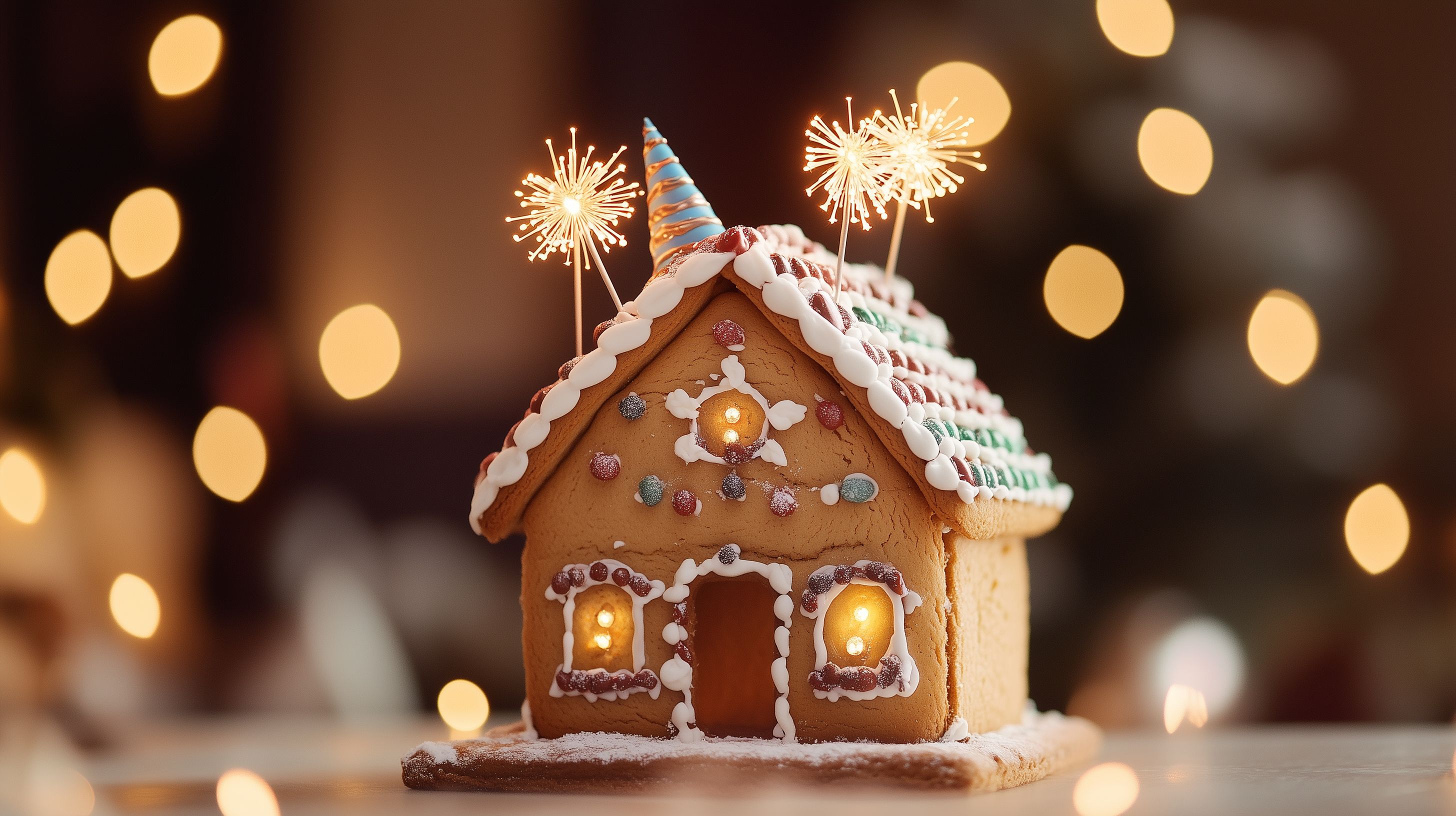 Das Foto zeigt ein detailliert dekoriertes Lebkuchenhaus, umgeben von Lichterketten und funkelnden Wunderkerzen. Das süße Backwerk ist mit farbigen Streuseln und leuchtendem Zuckerguss verziert, während auf dem Dach Zuckerspitzen und Feuerwerk für eine festliche Atmosphäre sorgen. Die dunkle Umgebung mit Bokeh-Effekt verleiht dem Bild eine romantische, weihnachtliche Stimmung.