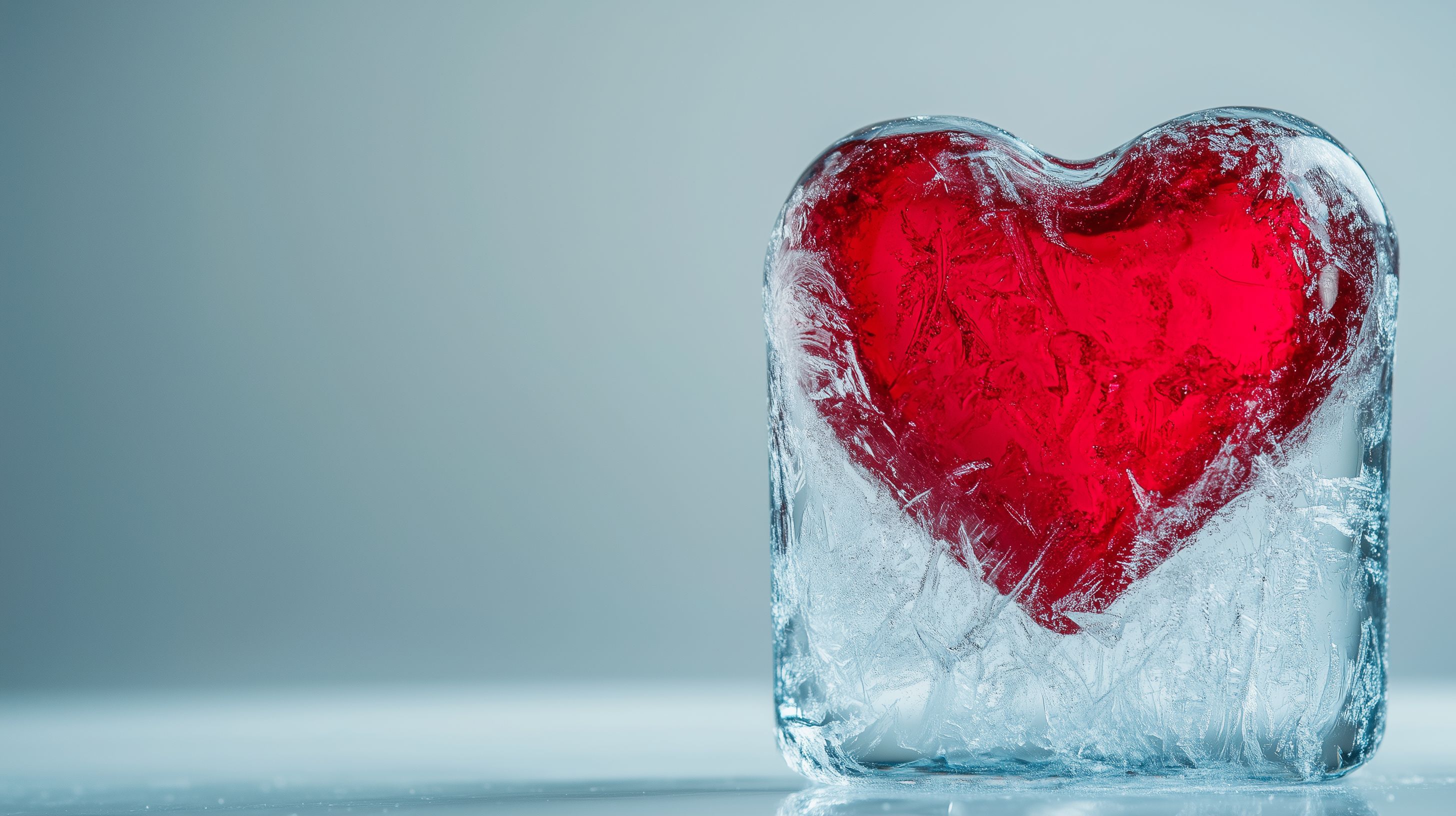 Das Bild zeigt ein rotes Herz, das in einem durchsichtigen Eisblock eingefroren ist. Der Eisblock hat eine unregelmäßige, organische Form und steht vor einem hellgrauen Hintergrund. Das Herz ist klar und deutlich zu erkennen, während das Eis um es herum eine glitzernde, kristalline Struktur aufweist. Das Motiv vermittelt eine Stimmung von Kälte, Stillstand und emotionaler Distanz, aber auch von Schönheit und Verletzlichkeit. Es eignet sich gut als Hintergrund- oder Illustrationsbild für Themen wie Liebe, Gefühle, Winterstimmung oder Fotografie. Das hochauflösende Stockfoto ist unter der Creative-Commons-Lizenz frei verwendbar.