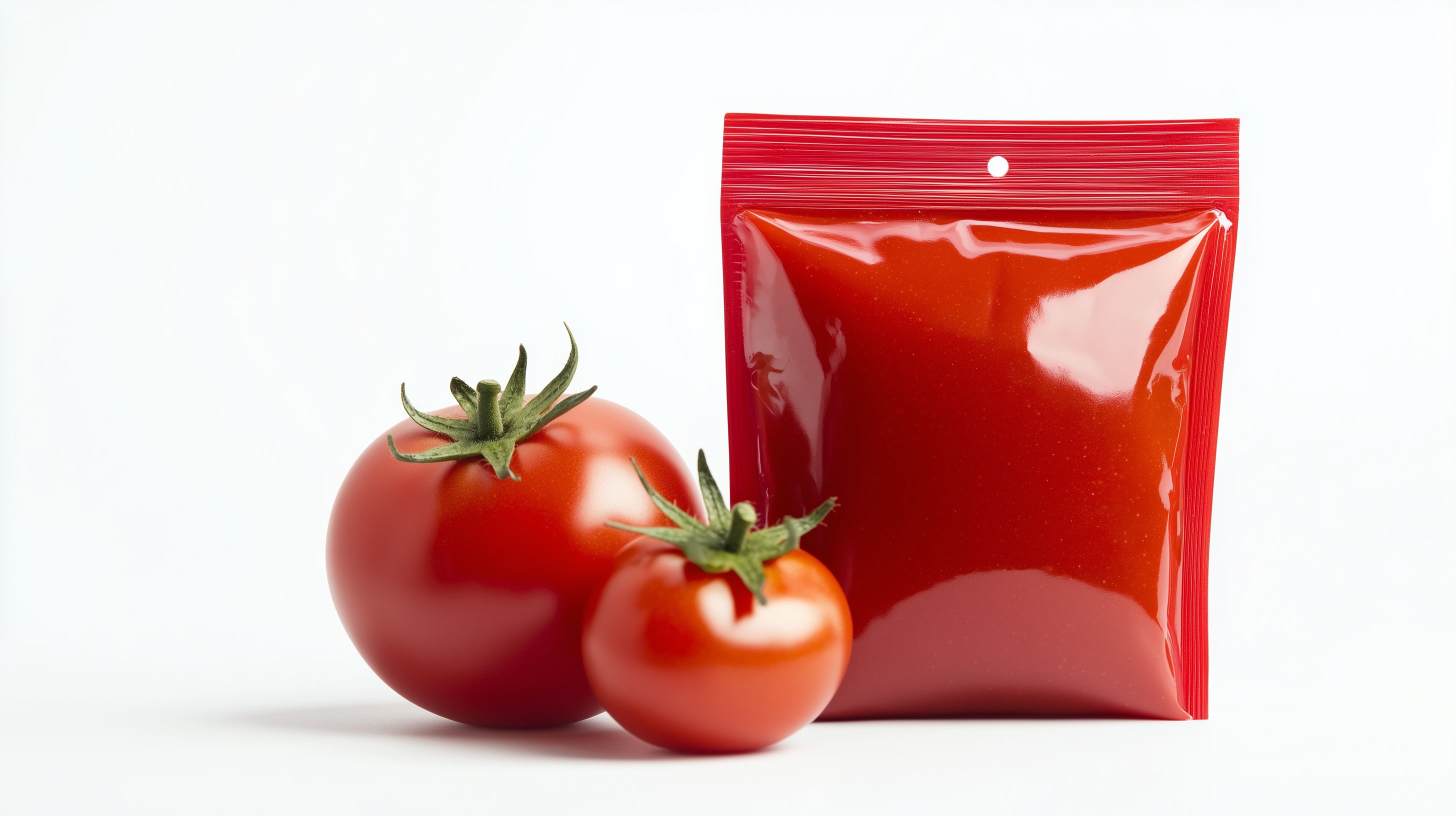 Dieses Foto zeigt zwei frisch geerntete Tomaten sowie eine Packung mit roter Tomatensauce vor weißem Hintergrund. Die Tomaten sind leuchtend rot und wirken reif und saftig. Die Tomatensauce ist in einem roten, wiederverschließbaren Plastikbeutel verpackt, der den Inhalt schützt und aufbewahrt. Das Foto hat eine natürliche, lebensmittelfotografische Ästhetik und kann für verschiedene Zwecke wie Rezeptblogs, Social-Media-Posts oder Werbematerialien verwendet werden. Als hochauflösendes Creative-Commons-Foto ist es kostenfrei nutzbar.