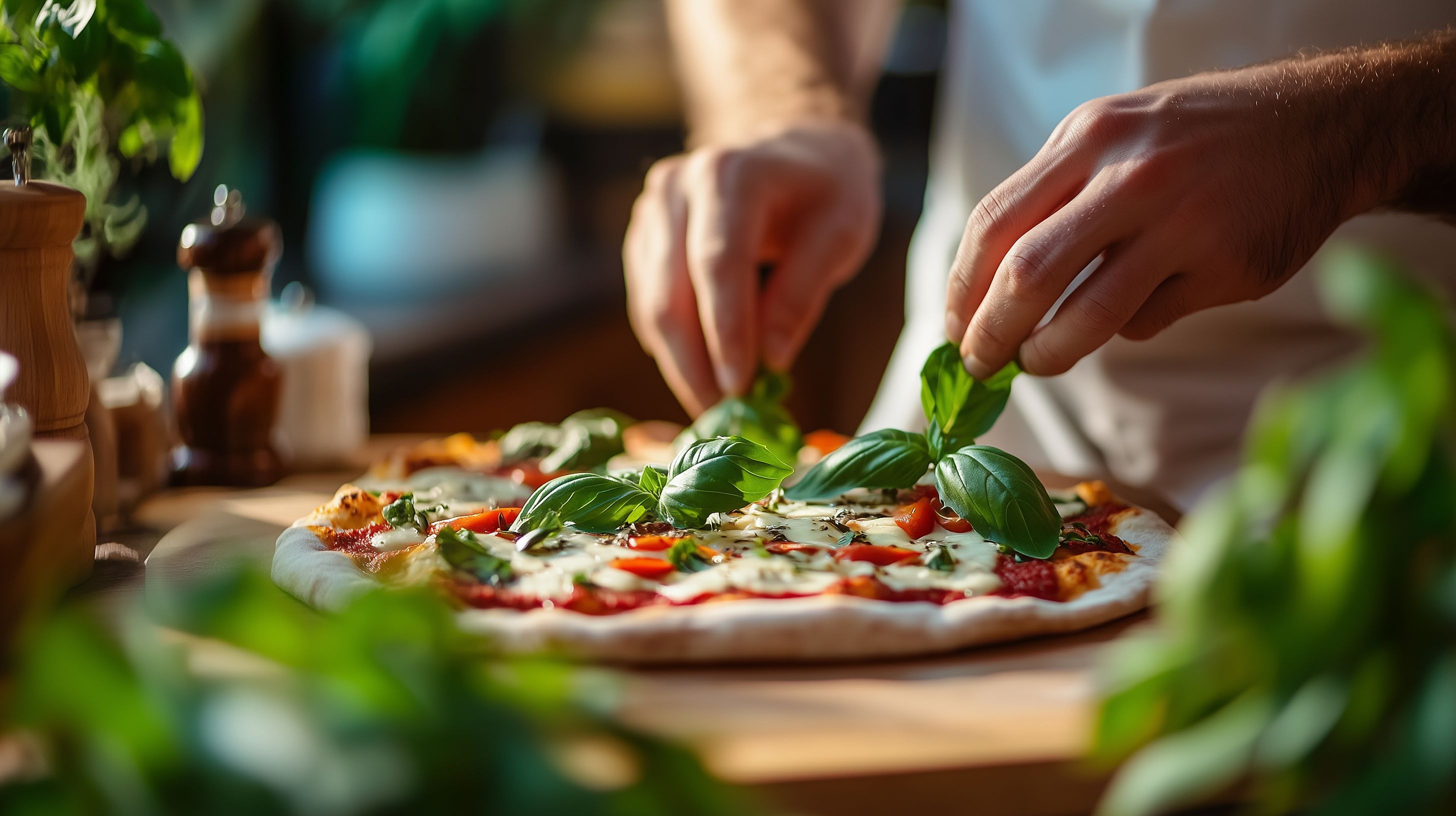 Dieses Foto zeigt die Zubereitung eines appetitlichen Gemüse-Salats. Zu sehen sind Hände, die frisches Basilikum auf eine Pizza oder einen Salatteller legen. Der Salat besteht aus Tomaten, Paprika und anderen grünen Zutaten, die auf einem rustikalen Holzbrett angerichtet sind. Im Hintergrund sind weitere Gewürze, Öle und Küchenutensilien zu erkennen, was eine lebendige Küchenszene erzeugt. Das Foto eignet sich hervorragend als kostenloses Stockfoto für Blogs, Newsletter oder Social-Media-Beiträge rund um gesunde Ernährung, Kochen und Kulinarik in hoher Auflösung unter einer Creative-Commons-Lizenz.