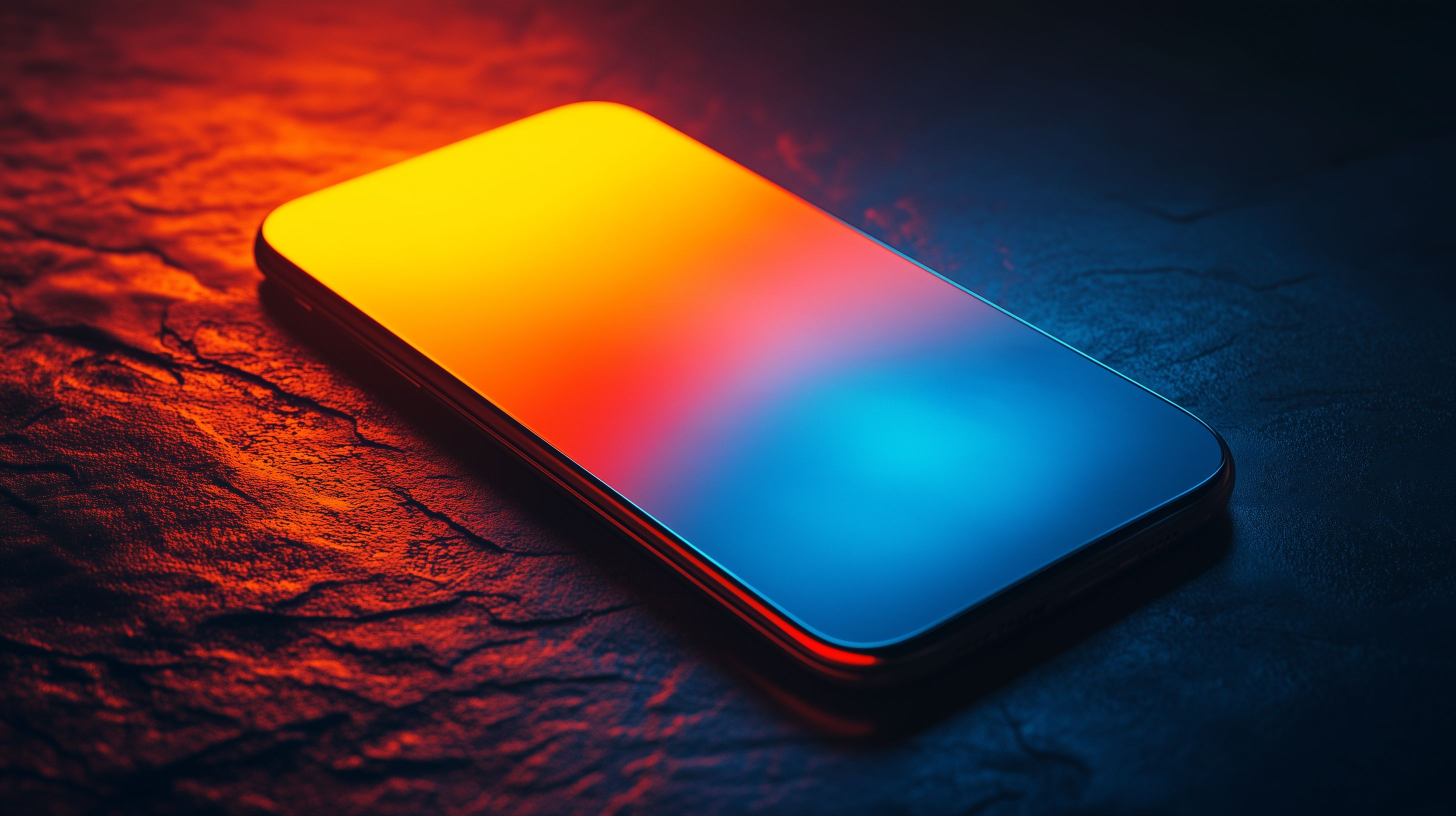 Dieses farbenfrohe Bild zeigt ein Smartphone in einer beeindruckenden Beleuchtung. Das Gerät ist im Hochformat positioniert und liegt auf einer dunklen, strukturierten Oberfläche. Die Beleuchtung ist dominant und verleiht dem Smartphone eine moderne, fast schon mystische Ausstrahlung. Die leuchtenden Farben Rot, Orange und Blau formen einen Farbverlauf, der den Fokus auf das Gerät lenkt und eine abstrakte, grafische Ästhetik schafft.