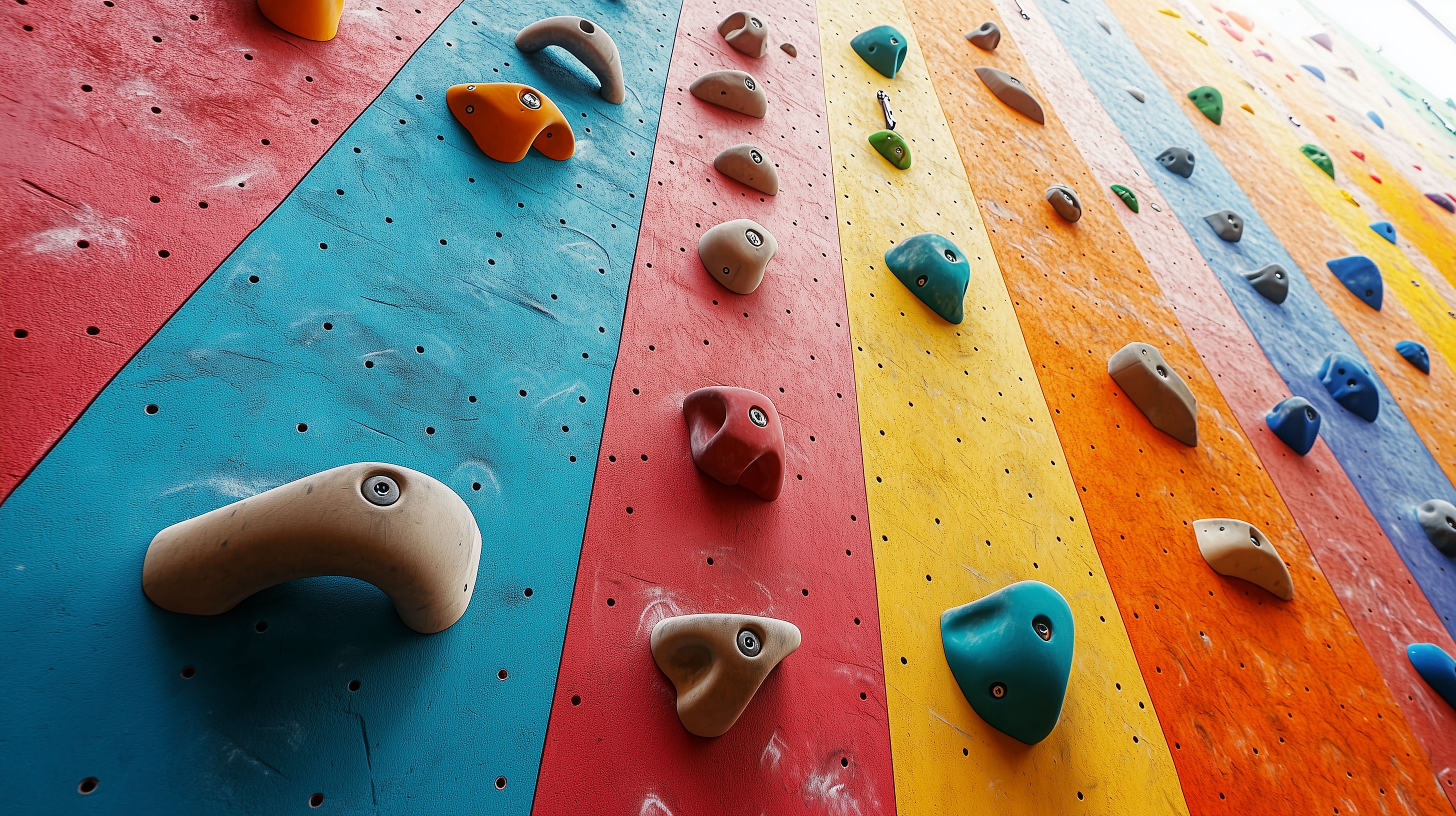 Dieses bunte Foto zeigt eine moderne Kletterwand mit verschiedenfarbigen Griffen in einer Turnhalle oder einem Indoor-Kletterzentrum. Die Wand erstreckt sich über mehrere Reihen und bietet eine Vielzahl an Kletteroptionen für Sportler unterschiedlicher Fähigkeitsstufen. Die kräftigen Farben wie Rot, Blau, Gelb und Orange schaffen eine lebendige, anregende Atmosphäre und unterstreichen den Spaß- und Herausforderungscharakter des Kletterns. Dieses Foto eignet sich hervorragend für den Einsatz in Blogs, Newslettern, Social-Media-Kanälen oder Werbematerialien rund um Sport, Fitness und einen aktiven Lebensstil. Es steht unter einer Creative-Commons-Lizenz zur freien Nutzung zur Verfügung und ist in hoher Auflösung erhältlich.