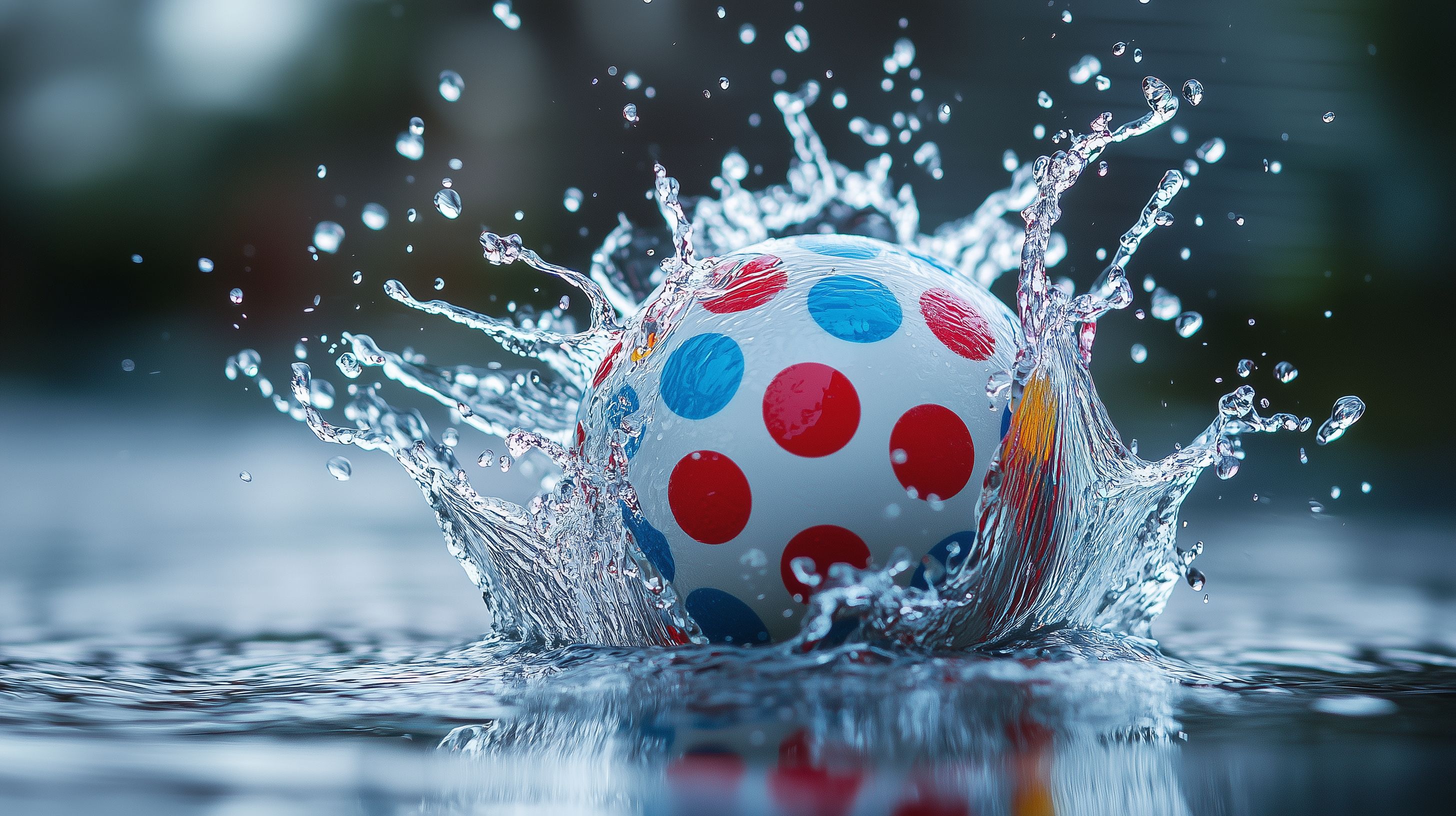 Das Bild zeigt einen bunten Plastikball mit Polka-Punkten, der in einem Wassersplash getaucht ist. Der Ball scheint aus dem Wasser aufzutauchen und wird von Farbspritzern und Wassertropfen umgeben. Die Komposition ist dynamisch und farbenfroh, was sie für verschiedene Einsatzzwecke wie Werbung, Social Media-Posts oder Grußkarten geeignet macht. Dieses hochauflösende Stockfoto ist unter der Creative-Commons-Lizenz kostenfrei nutzbar.