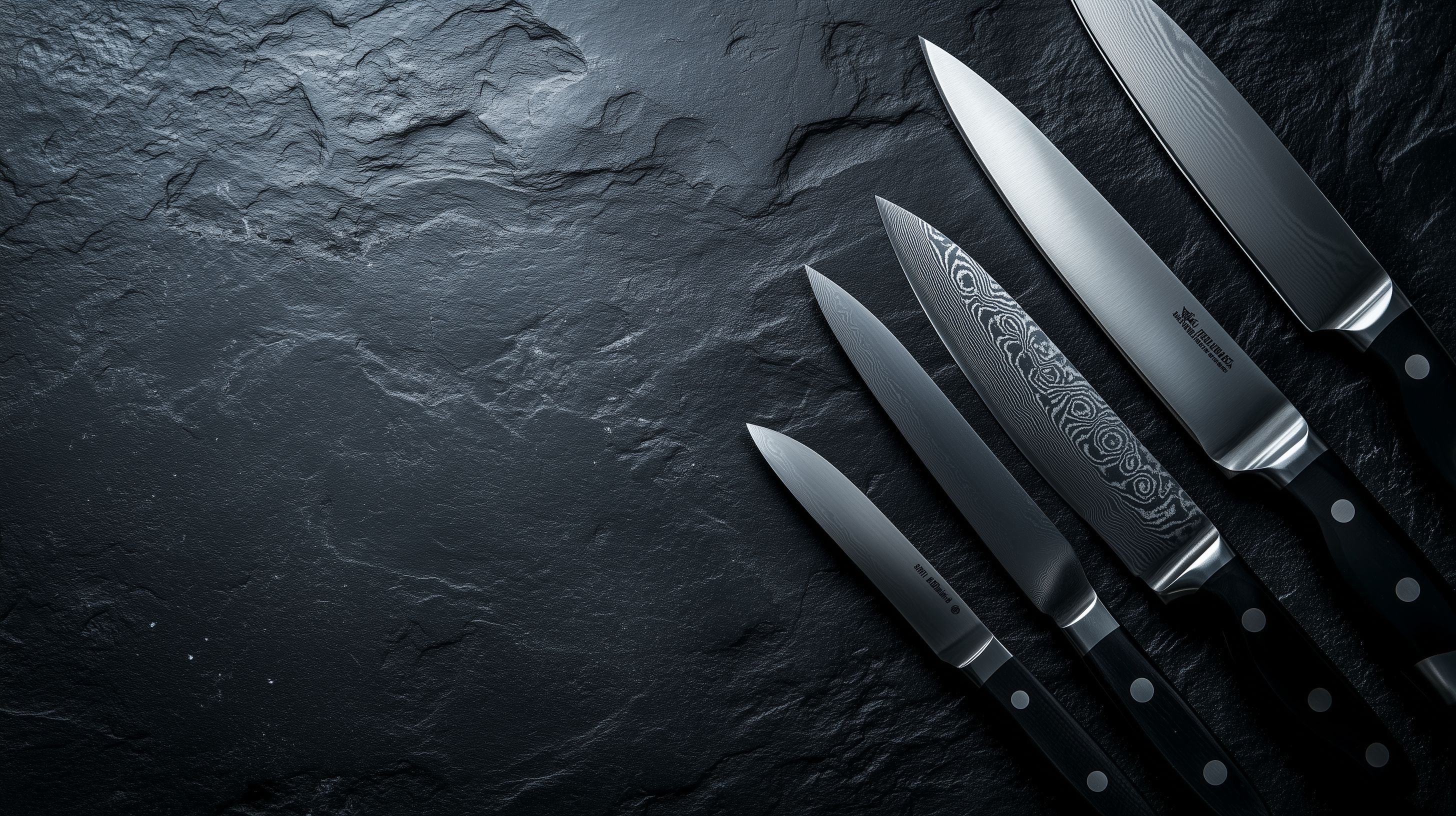 Dieses Foto zeigt eine Sammlung von eleganten, schwarz glänzenden Messern auf einem dunklen Schieferstein-Hintergrund. Die Messer haben eine moderne, stilvolle Optik mit einem auffälligen Design auf den Klingen. Sie sind perfekt für den Einsatz in der Küche, sei es zum Kochen, Schneiden oder Dekorieren. Die dunkle, reduzierte Farbgebung und die minimalistische Komposition verleihen dem Bild eine klare, ästhetische Ausstrahlung. Dieses hochwertige Stockfoto eignet sich hervorragend für den Einsatz in Blogs, Werbemitteln oder Social-Media-Kanälen, wo es eine elegante und professionelle Bildsprache vermittelt. Das Foto ist in hoher Auflösung verfügbar und unter einer Creative-Commons-Lizenz frei verwendbar.