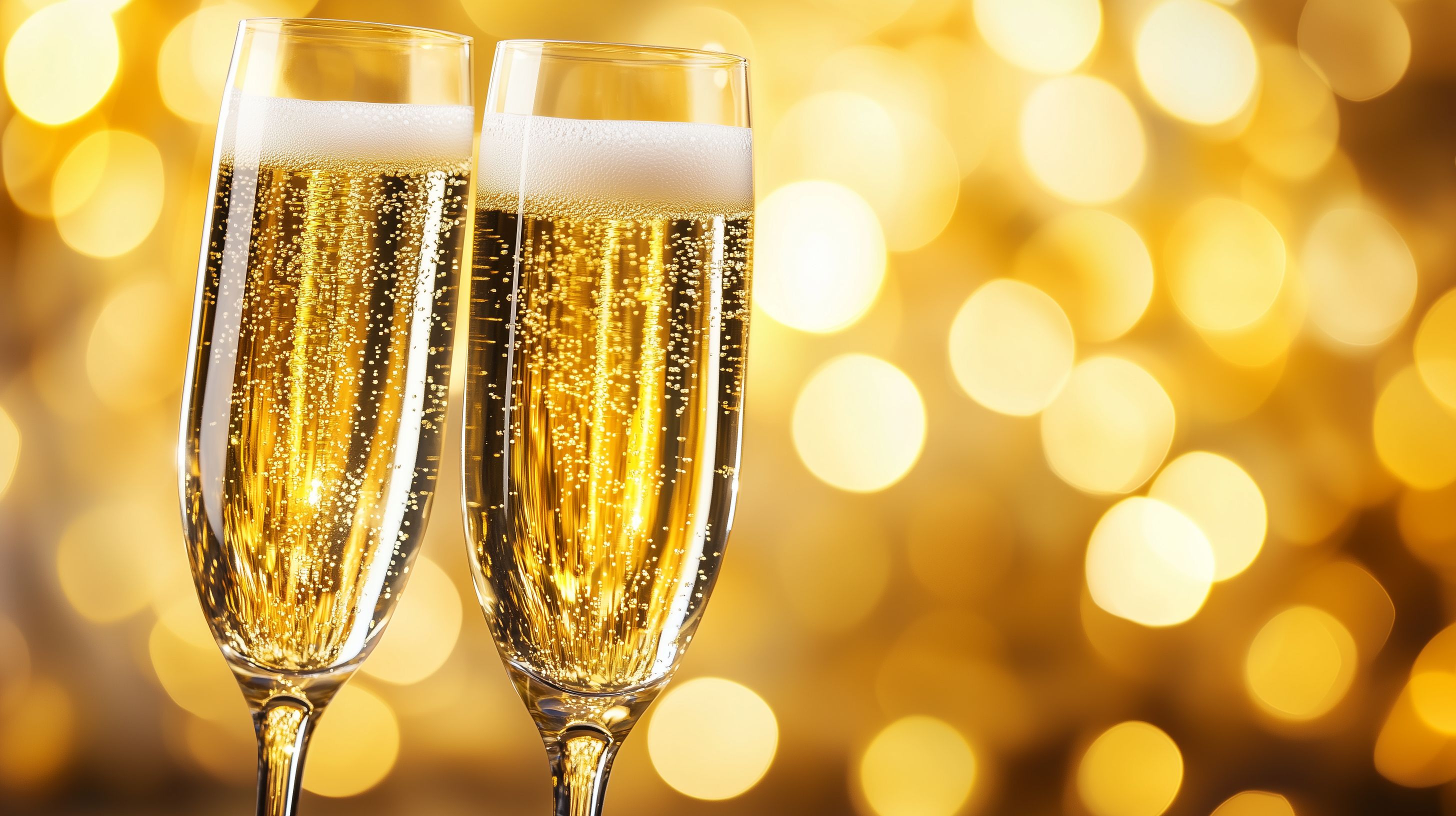 Dieses Foto zeigt zwei mit Champagner gefüllte Sektgläser vor einem Hintergrund aus goldenen, funkelnden Lichtern. Die Gläser stehen aufrecht und die Flüssigkeit im Glas glitzert, was eine festliche und elegante Atmosphäre erzeugt. Der Fokus liegt auf den Gläsern, während der Hintergrund verschwommen und verwischt erscheint, wodurch die Sektgläser im Mittelpunkt stehen. Das Bild ist ideal für die Verwendung in Blogs, Newslettern, auf Social-Media-Kanälen oder in Werbematerialien, die eine festliche, luxuriöse und exklusive Stimmung vermitteln wollen. Dieses hochauflösende Stockfoto ist unter einer Creative-Commons-Lizenz frei verfügbar.