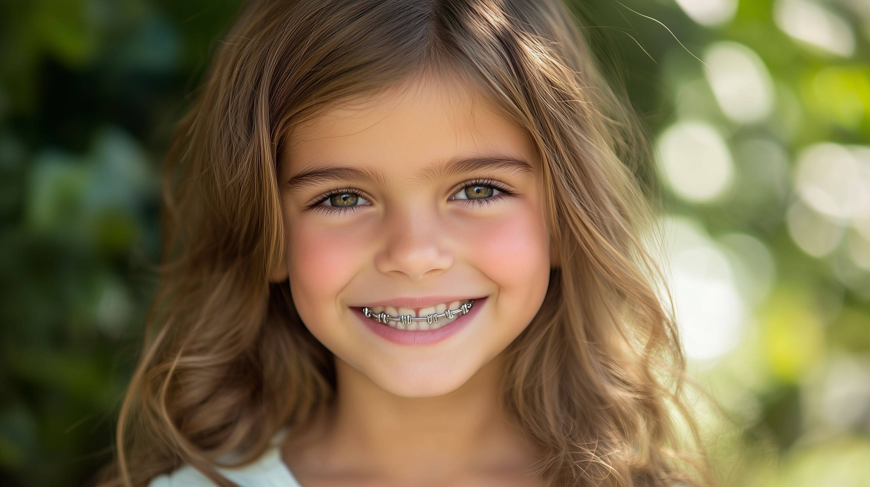 Das Bild zeigt ein fröhliches Mädchen mit Zahnspange, das in die Kamera lächelt. Die Aufnahme wurde im Freien gemacht, mit unscharfen, grünen Hintergründen, die einen natürlichen Eindruck vermitteln. Das Mädchen hat blonde Locken und strahlend grüne Augen. Das Foto versprüht eine positive, unbeschwerte Stimmung und eignet sich hervorragend für den Einsatz in Blogs, Social-Media-Beiträgen oder Werbematerialien, die ein jugendliches, freundliches Image vermitteln möchten. Dieses hochauflösende Stockfoto ist unter der Creative-Commons-Lizenz kostenlos für private und kommerzielle Zwecke nutzbar.