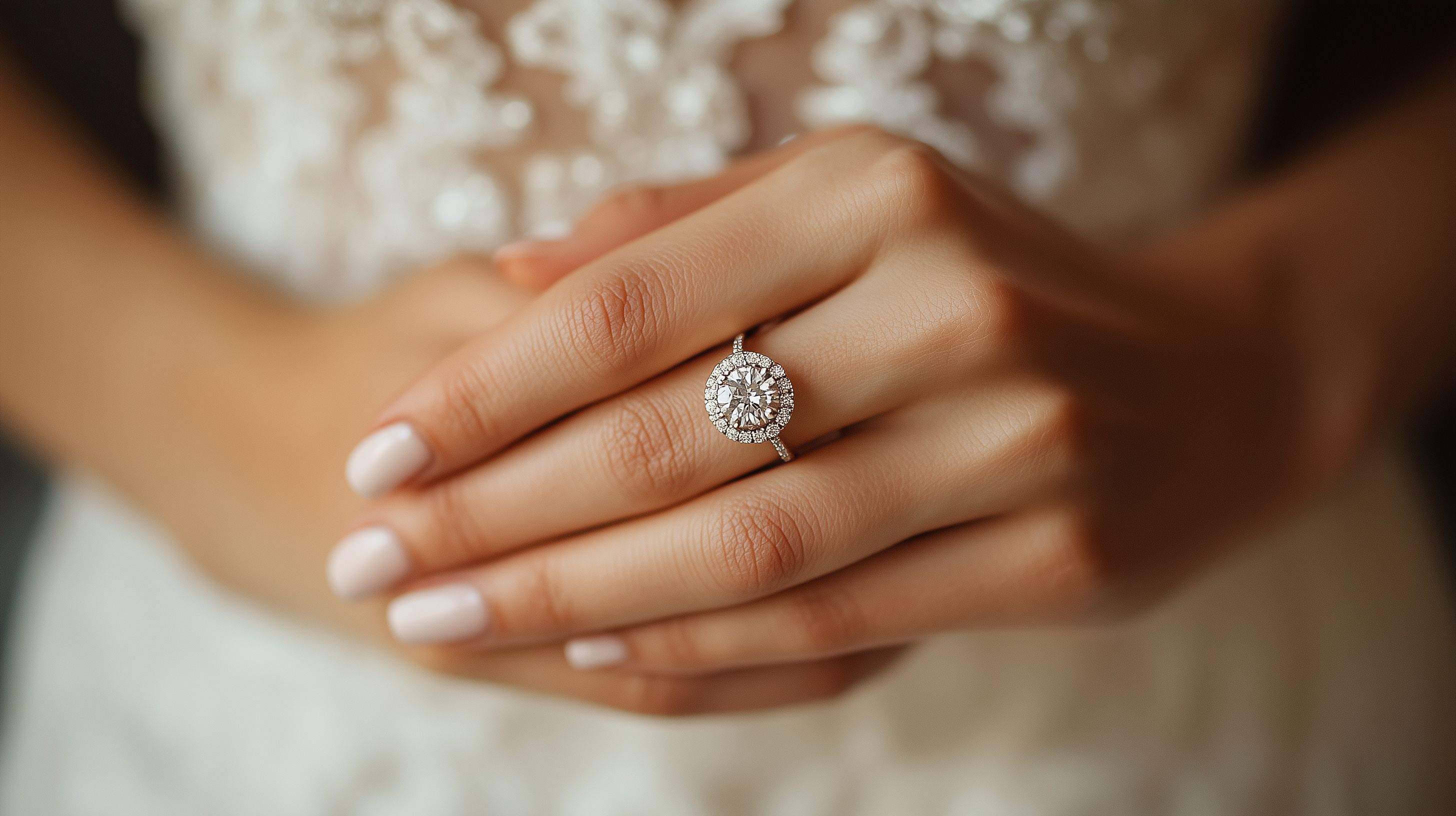Dieses stimmungsvolle Foto zeigt eine Nahaufnahme einer Hand, an der ein funkelnder Verlobungsring mit einem runden Diamanten zu sehen ist. Die zarte, weibliche Hand ist von zarten, weißen Blüten umrahmt, die den romantischen Charakter der Szene unterstreichen. Das Bild vermittelt Eleganz, Zartheit und die Freude über einen besonderen Moment. Es eignet sich hervorragend als kostenloses Stockfoto für Hochzeits- und Liebesthemen in Blogs, Newslettern oder Social-Media-Posts. Die hochwertige Auflösung und die Creative-Commons-Lizenz ermöglichen eine vielfältige Nutzung des Bildes.