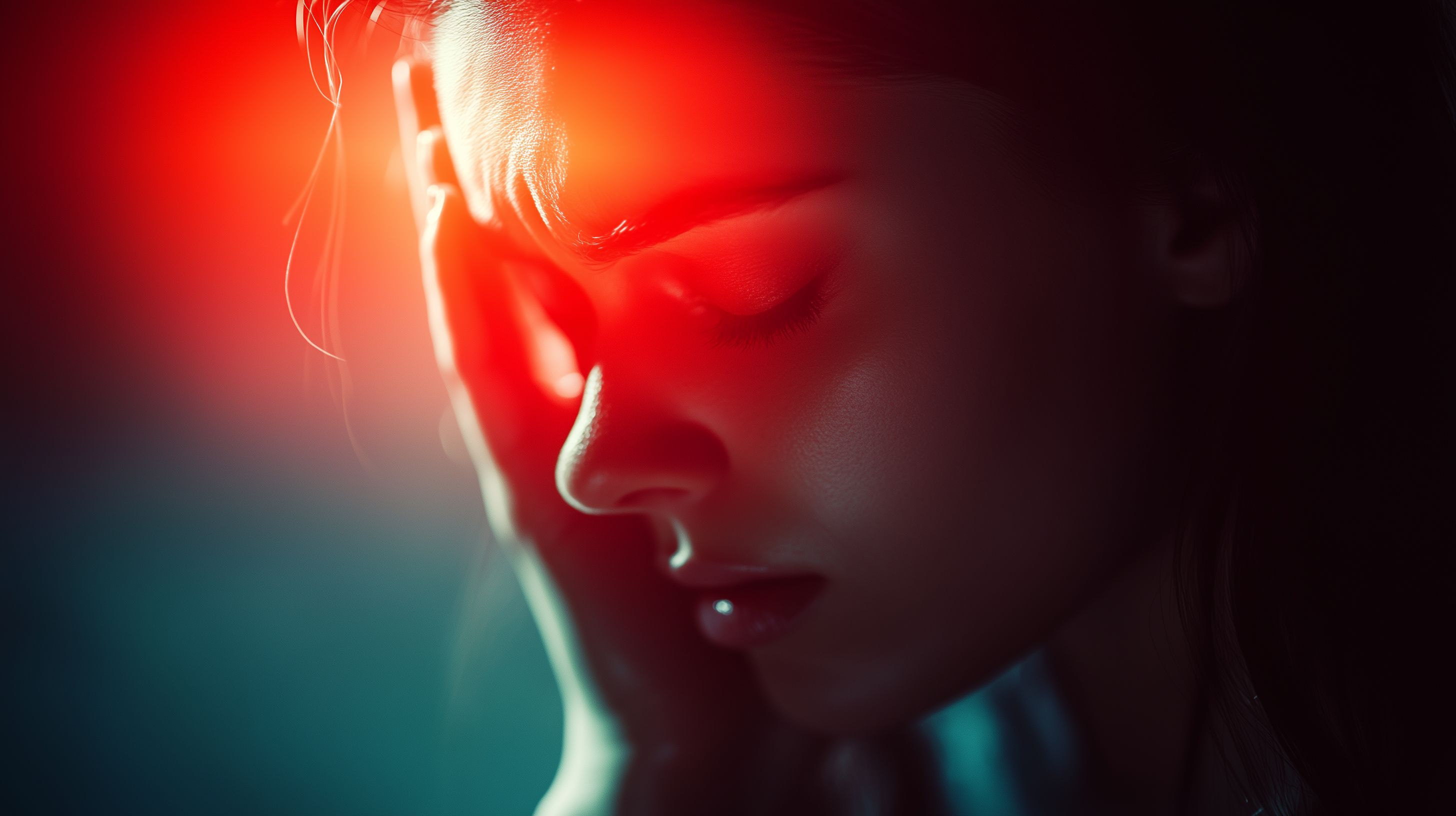 Das Bild zeigt eine nahaufnahme einer Frau, deren Gesichtsausdruck einen intensiven Kopfschmerz widerspiegelt. Ihre Stirn ist gerunzelt und ihr Blick ist konzentriert, was den Schmerz, den sie empfindet, deutlich macht. Die rötlichen und grünlichen Farbtöne verleihen der Szene eine dramatische Atmosphäre und unterstreichen die Intensität des Moments.