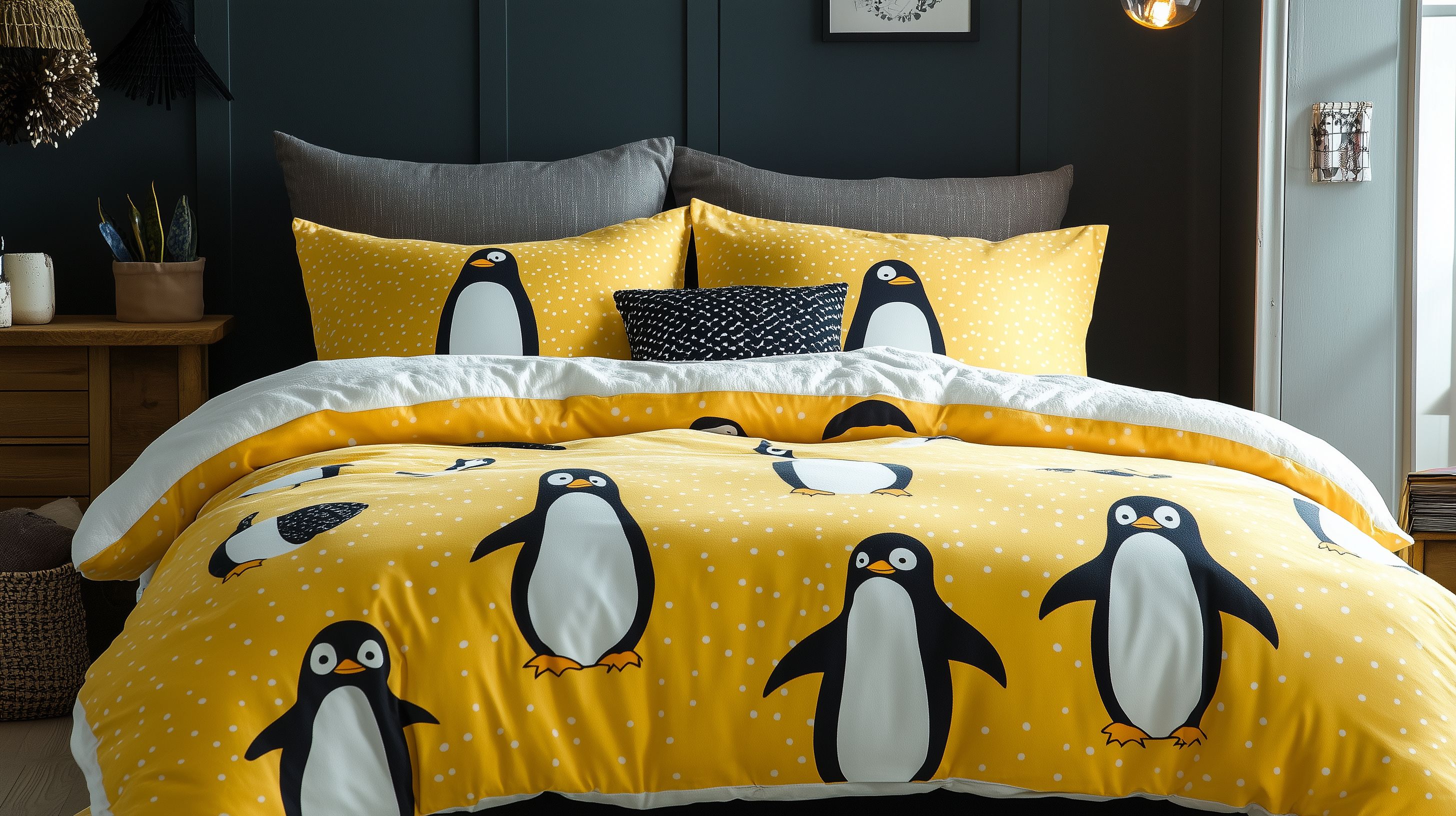 Dieses Foto zeigt ein gemütliches Schlafzimmer mit einer Bettwäsche im auffallenden Pinguindesign. Die gelbe Bettwäsche ist mit schwarzen Pinguinen und weißen Punkten bedruckt, die ein fröhliches und verspieltes Motiv ergeben. Dazu passen die grauen Kissen mit weiteren Pinguin-Applikationen. Die Einrichtung ist insgesamt dunkel und stimmungsvoll gehalten, mit einer Pendelleuchte und Dekoelementen aus Holz, die eine warme Atmosphäre schaffen. Dieses kostenlose Stockfoto in hoher Auflösung unter Creative-Commons-Lizenz eignet sich perfekt für Blogbeiträge, Newsletter oder Social-Media-Posts rund um Schlafzimmer-Trends, Heimtextilien oder gemütliche Einrichtungsideen.