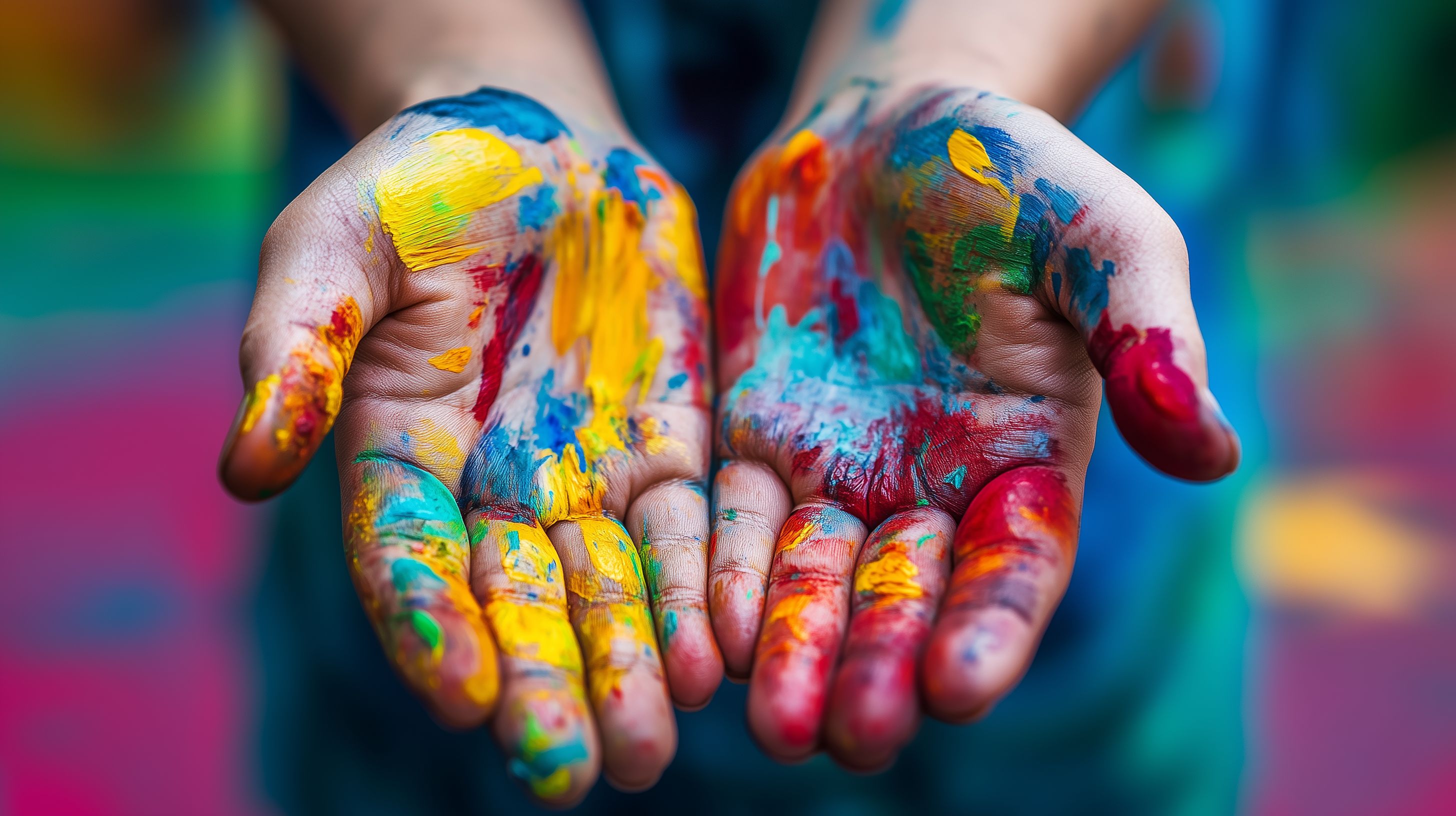 Dieses faszinierende Bild zeigt die Hände einer Person, die in einem Farbenmeer zu versinken scheinen. Die Handflächen sind mit einer Vielzahl an leuchtenden Farbtönen überzogen - von kräftigem Gelb über strahlendes Rot bis hin zu sanftem Blau. Die Komposition lenkt den Blick direkt auf dieses kreative Farbspektakel, das Emotionen und künstlerischen Ausdruck widerspiegelt. Dieses hochauflösende Stockfoto lässt sich vielfältig einsetzen - sei es in Blogbeiträgen, Newslettern, auf Social-Media-Kanälen oder in Werbekampagnen rund um die Themen Kunst, Kreativität und Selbstausdruck. Als kostenloses Bild unter Creative-Commons-Lizenz ist es frei verwendbar.