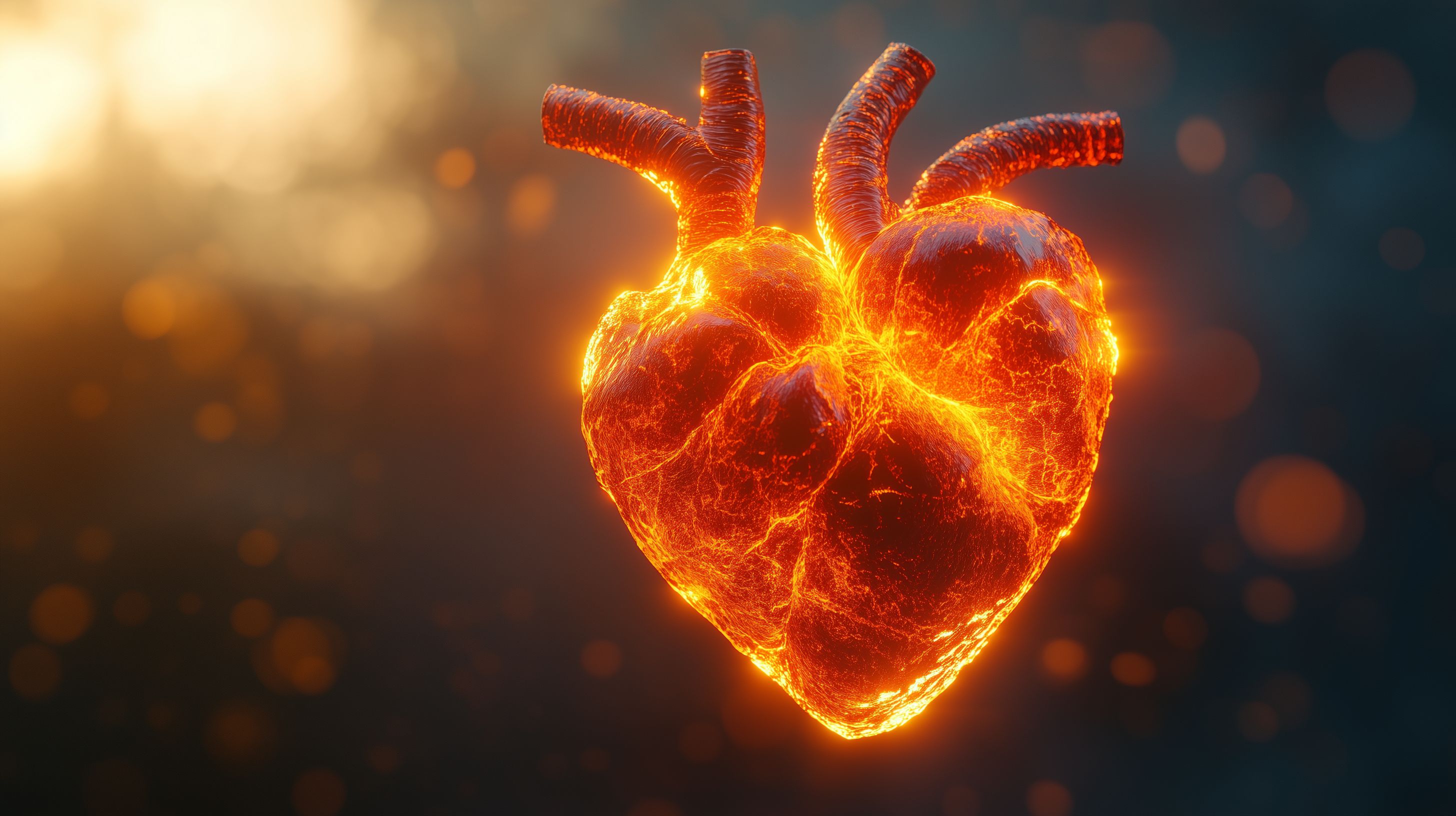 Das Bild zeigt ein realistisch dargestelltes, dreidimensionales Modell eines menschlichen Herzens in leuchtendem Orange und Rot. Das Herz scheint von innen zu glühen, als würde es vor Energie und Lebenskraft nur so strotzen. Die Perspektive ist nah und fokussiert, so dass das Organ im Mittelpunkt steht. Die Oberfläche des Herzens ist detailliert und strukturiert dargestellt, was dem Bild eine beeindruckende Tiefe und Intensität verleiht.