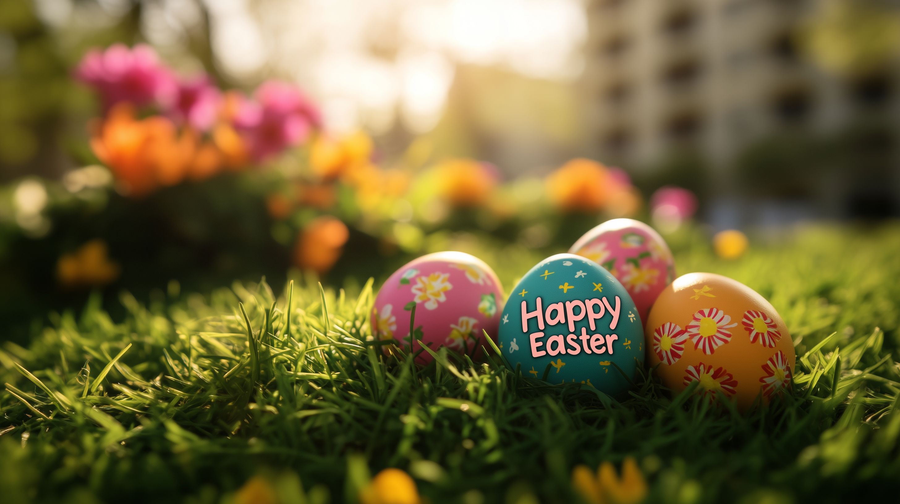 Das Foto zeigt eine idyllische Szene für Ostern. Im grünen Gras liegen bunte Ostereier, einige davon mit Aufschrift 'Happy Easter'. Im Hintergrund sind verschwommen blühende Blumen in Orange und Pink zu sehen, die eine sommerliche und fröhliche Atmosphäre schaffen. Dieses Bild eignet sich hervorragend als kostenloses Stockfoto für Grußkarten, Newsletter, Social-Media-Posts oder Werbemittel rund um das Osterfest. Es ist in hoher Auflösung verfügbar und unter einer Creative-Commons-Lizenz nutzbar.