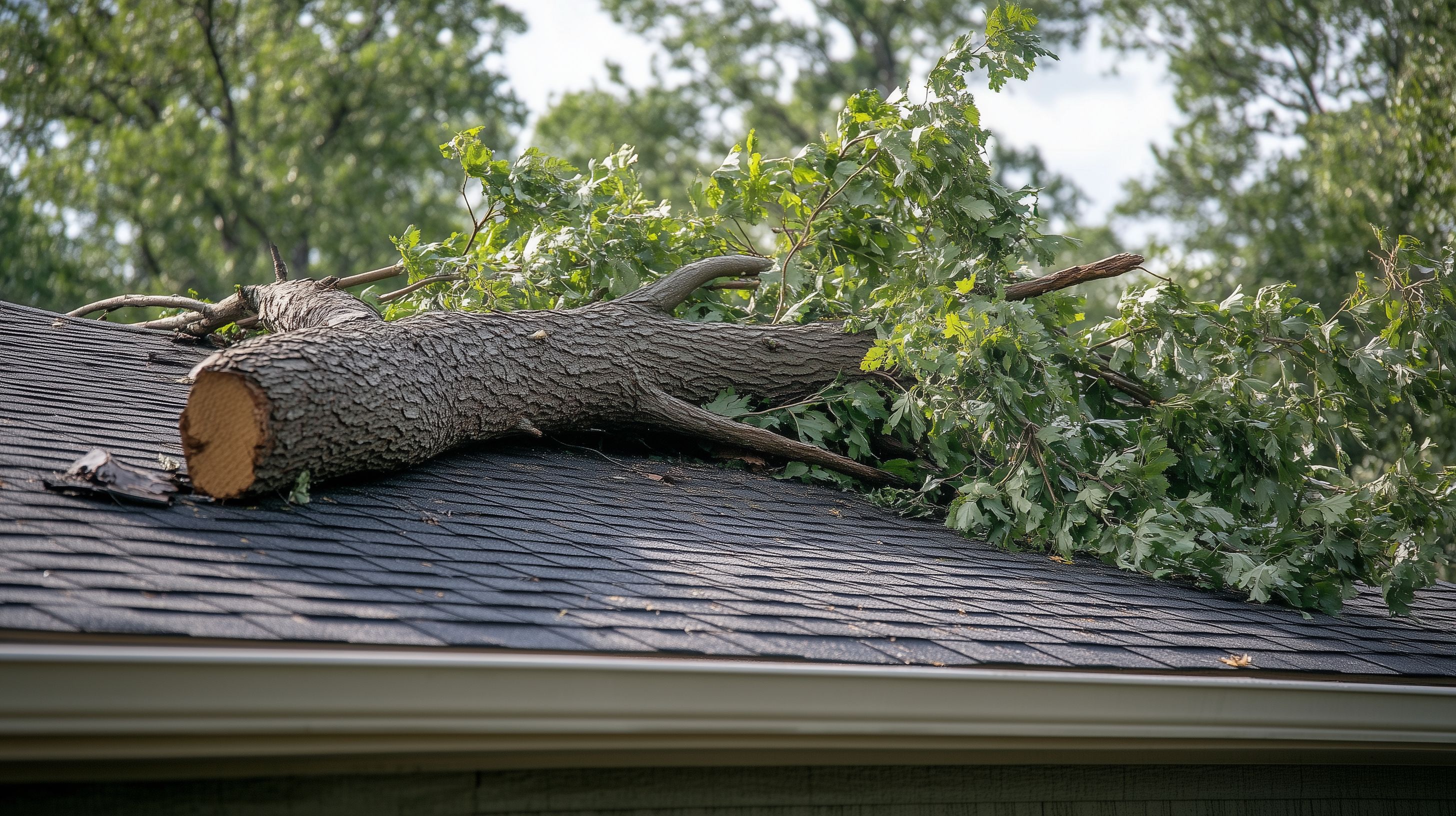 Dieses Foto zeigt die Überreste eines entwurzelten Baums, der während eines Sturms auf das Dach eines Hauses gestürzt ist. Die dicken Äste und Zweige mit den grünen Blättern liegen quer über dem dunklen Dachschindeln. Dieser dramatische Ausgang eines Unwetters vermittelt die Gewalt und Zerstörungskraft der Natur. Das Bild eignet sich hervorragend als kostenloses Stockfoto für Blogger, Redaktionen oder Werbung, die über Naturkatastrophen, Umweltschäden oder Wetterereignisse berichten möchten. Die hochauflösende Aufnahme ist unter der Creative-Commons-Lizenz frei verwendbar.