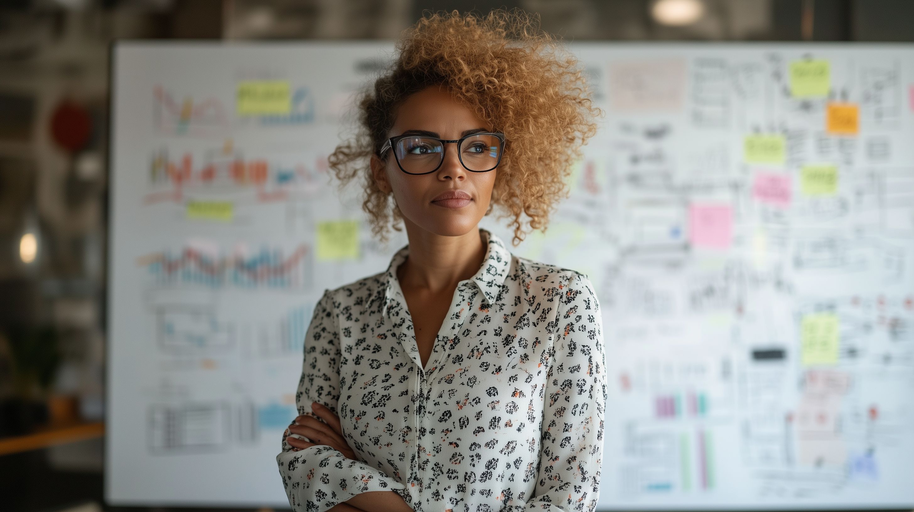 Das Foto zeigt eine junge, lockige Geschäftsfrau, die konzentriert an einem Whiteboard steht und eine neue Unternehmensstrategie präsentiert. Sie trägt eine bedruckte Bluse und eine Brille, was ihre professionelle Ausstrahlung unterstreicht. Im Hintergrund sind weitere Präsentationsunterlagen und Post-Its zu sehen, die den Arbeitsraum eines Büros widerspiegeln.