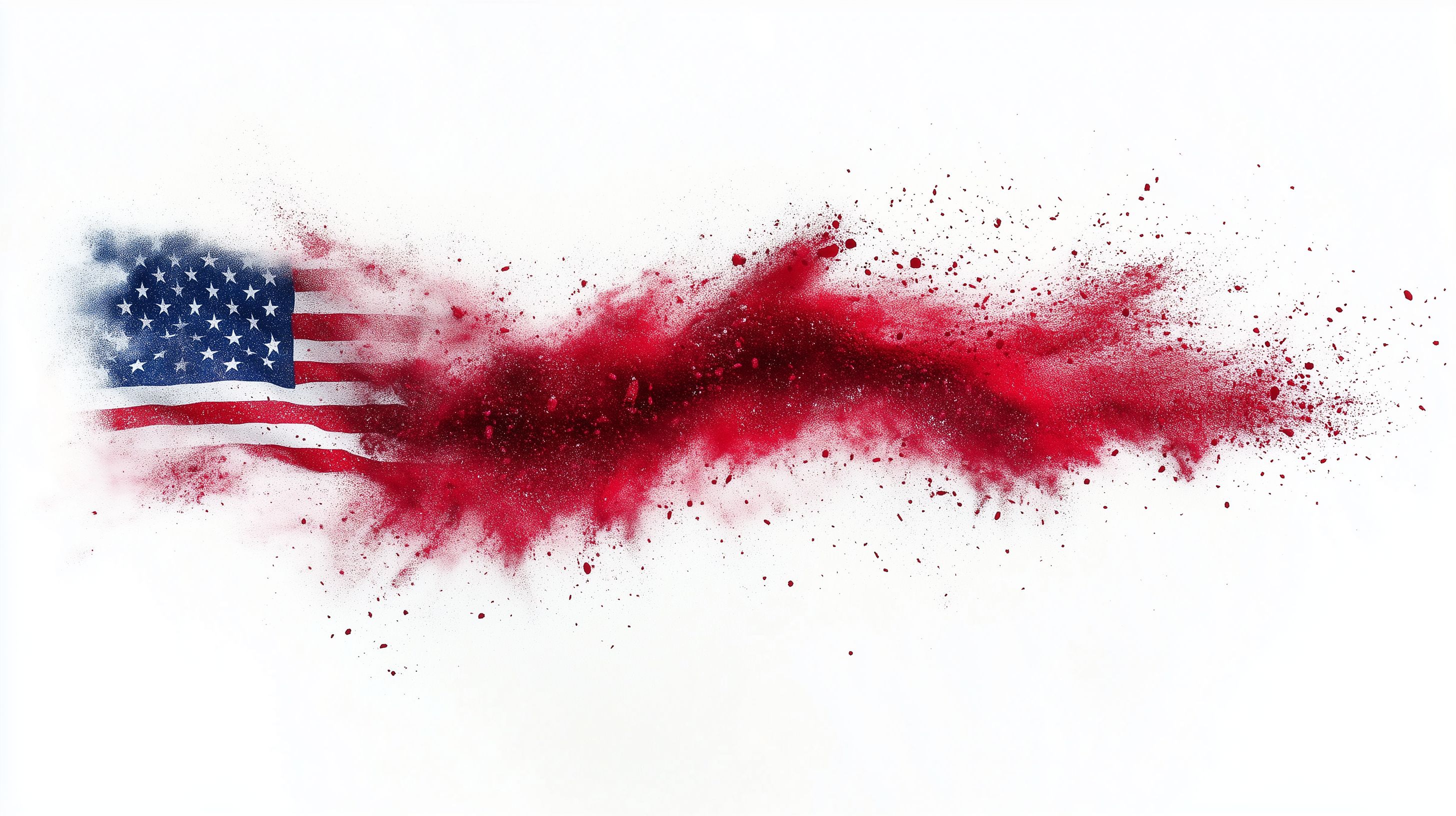 Das Bild zeigt eine dramatische Darstellung der amerikanischen Flagge, die in einer explosiven Wolke aus rotem Farbpulver gehüllt ist. Die Flagge selbst ist deutlich zu sehen, mit ihren charakteristischen weißen Sternen auf blauem Hintergrund und roten Streifen. Das Farbpulver erstreckt sich strahlenförmig um die Flagge herum und verleiht dem Bild eine dynamische, fast explosive Wirkung.