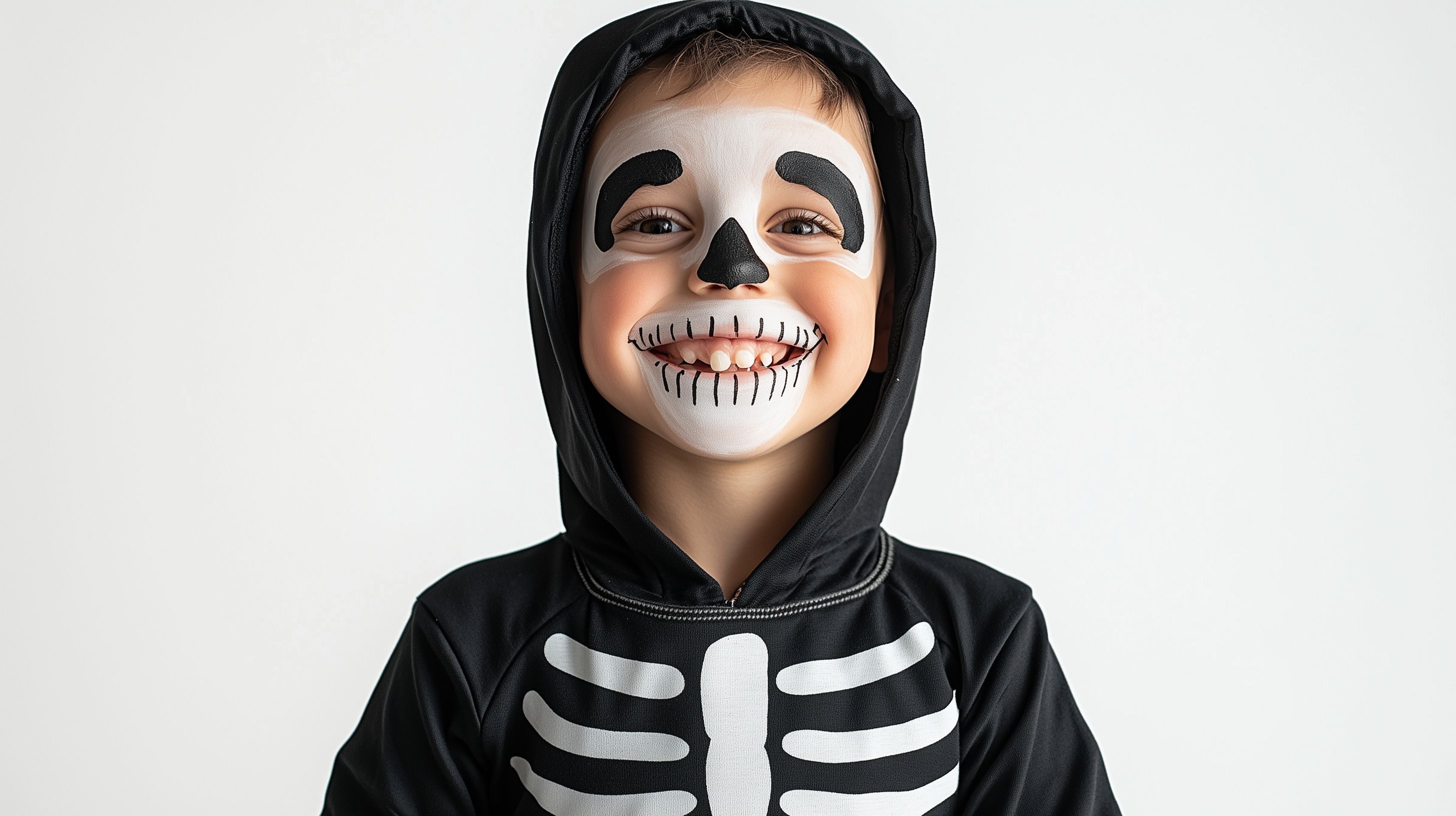 Das Foto zeigt ein lächelndes Kind, das ein Skelett-Kostüm mit Kapuze trägt. Das Kind blickt direkt in die Kamera und zeigt ein freudiges, fröhliches Gesichtsausdruck. Die Verkleidung ist schwarz-weiß gehalten, mit detaillierten Skelettzeichnungen. Der Hintergrund ist einfarbig und lenkt nicht vom Hauptmotiv ab. Dieses Stockfoto in hoher Auflösung eignet sich hervorragend für Halloween-Themen, Kinderfotos, Kostümpartys oder Werbematerialien wie Blogs, Newsletter oder soziale Medien. Es steht unter einer kostenlosen Creative-Commons-Lizenz zur Verfügung.