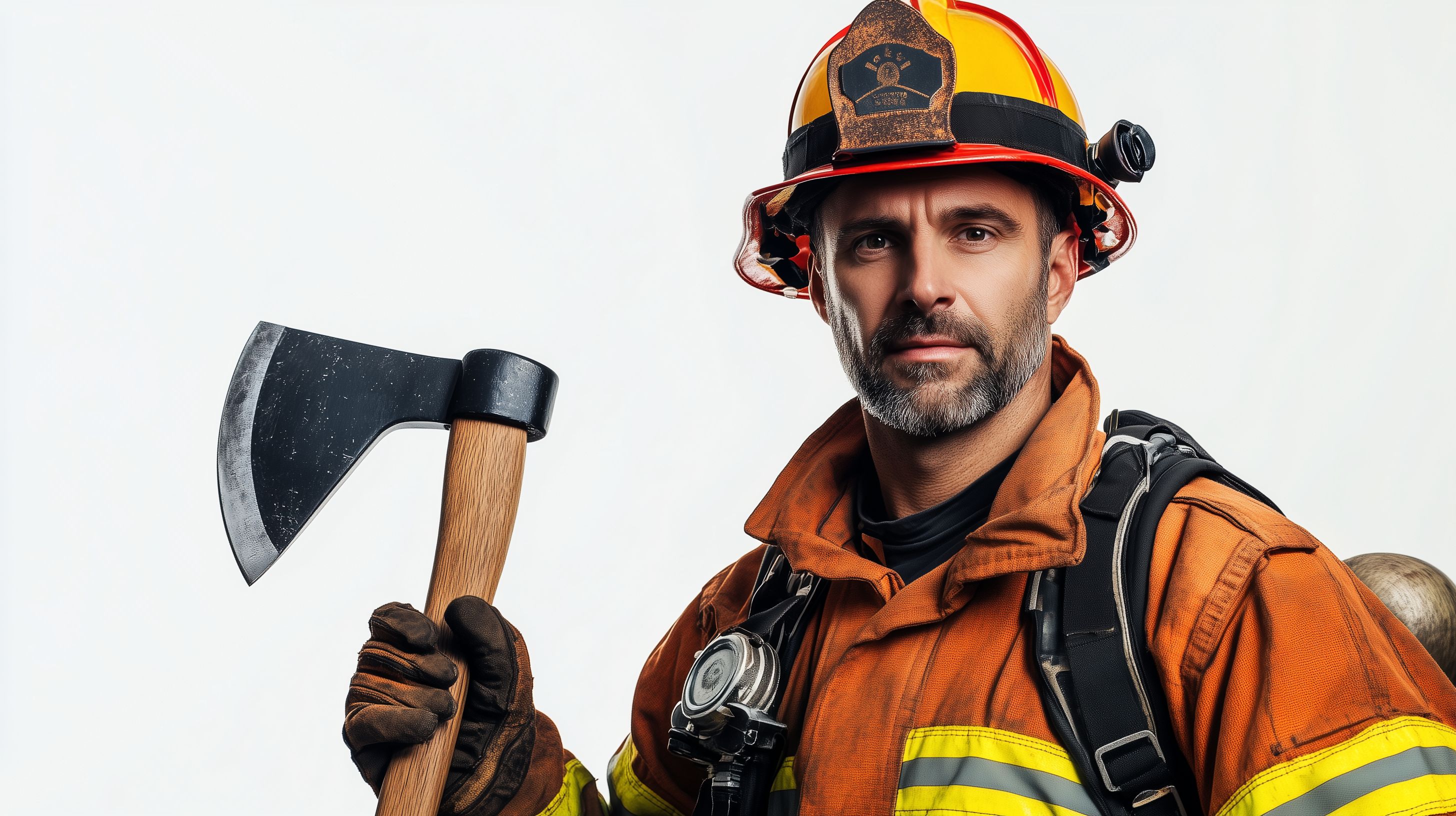 Das Foto zeigt einen Feuerwehrmann in voller Schutzausrüstung mit einem gelben Helm und einer orangefarbenen Jacke. Er hält eine Axt in der Hand und blickt konzentriert in die Kamera. Die Aufnahme wurde vor einem weißen Hintergrund gemacht, wodurch der Fokus ganz auf den Feuerwehrmann gelenkt wird. Dieses Stockfoto eignet sich hervorragend für die Verwendung in Blogs, Newslettern, Social-Media-Beiträgen oder Werbekampagnen rund um das Thema Feuerwehr, Katastrophenschutz und Rettungseinsätze. Es ist in hoher Auflösung verfügbar und kann unter einer kostenlosen Creative-Commons-Lizenz genutzt werden.