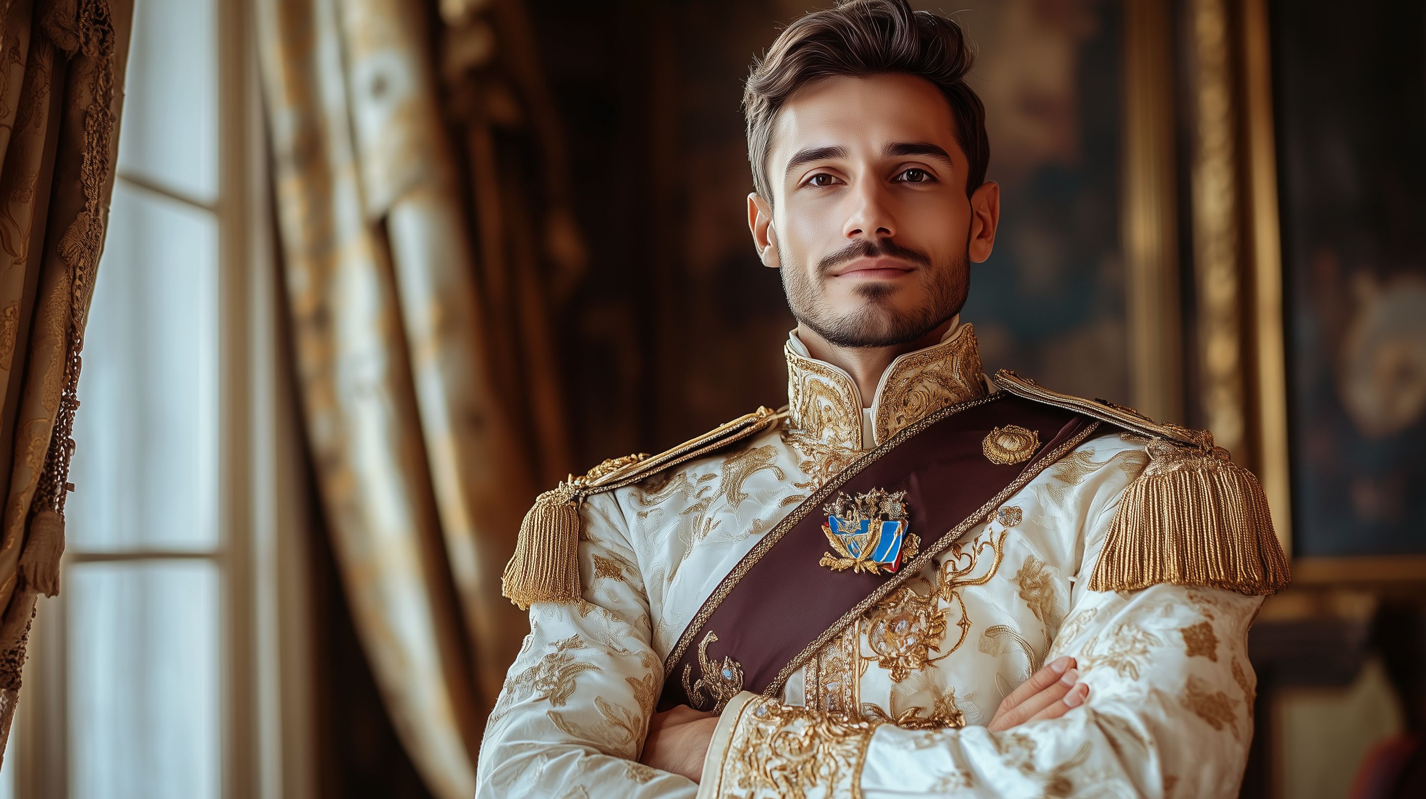 Das Bild zeigt einen elegant gekleideten jungen Mann in einer prunkvollen Militäruniform mit goldener Stickerei, Epauletten und einer prächtigen Schärpe. Er steht vor einem Fenster mit Samtvorhängen in einer historischen Kulisse, die auf einen fürstlichen Palast hinweist. Der Mann blickt selbstbewusst und würdevoll in die Kamera, was den Eindruck eines hohen Adligen oder Herrschers vermittelt. Das Foto eignet sich hervorragend als Titelbild für Artikel über Geschichtsepochen, königliche Familien oder als Hintergrund für Präsentationen zu Themen rund um Monarchie und Aristokratie. Als kostenloses Stockfoto in hoher Auflösung unter Creative-Commons-Lizenz ist es für viele Einsatzzwecke frei nutzbar.