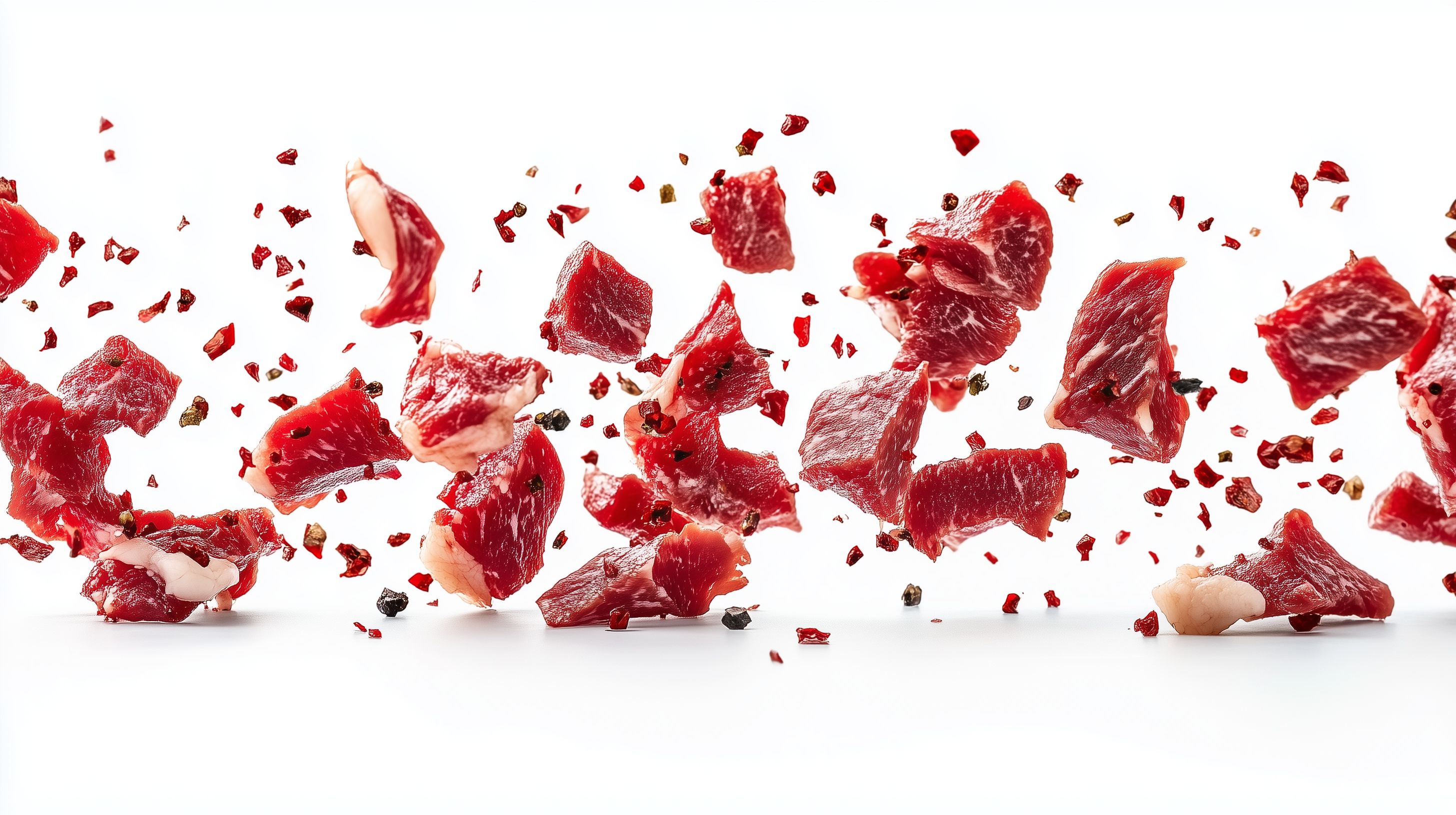 Diese Fotografie zeigt Fleischstücke in fliegender Bewegung auf einem weißen Hintergrund. Das Bild vermittelt eine dynamische und lebendige Präsentation des Fleisches, bei der die einzelnen Scheiben und Stücke in der Luft schweben. Die kräftigen roten Farbtöne des Fleisches bilden einen starken Kontrast zum neutralen Weiß des Hintergrundes und verleihen der Aufnahme eine besondere visuelle Anziehungskraft. Dieses Stockfoto eignet sich ideal für Kochbücher, Foodblogs, Social-Media-Kanäle oder Werbeanzeigen im Bereich Fleisch und Kulinarik. Es ist in hoher Auflösung verfügbar und kann unter einer Creative-Commons-Lizenz kostenfrei genutzt werden.