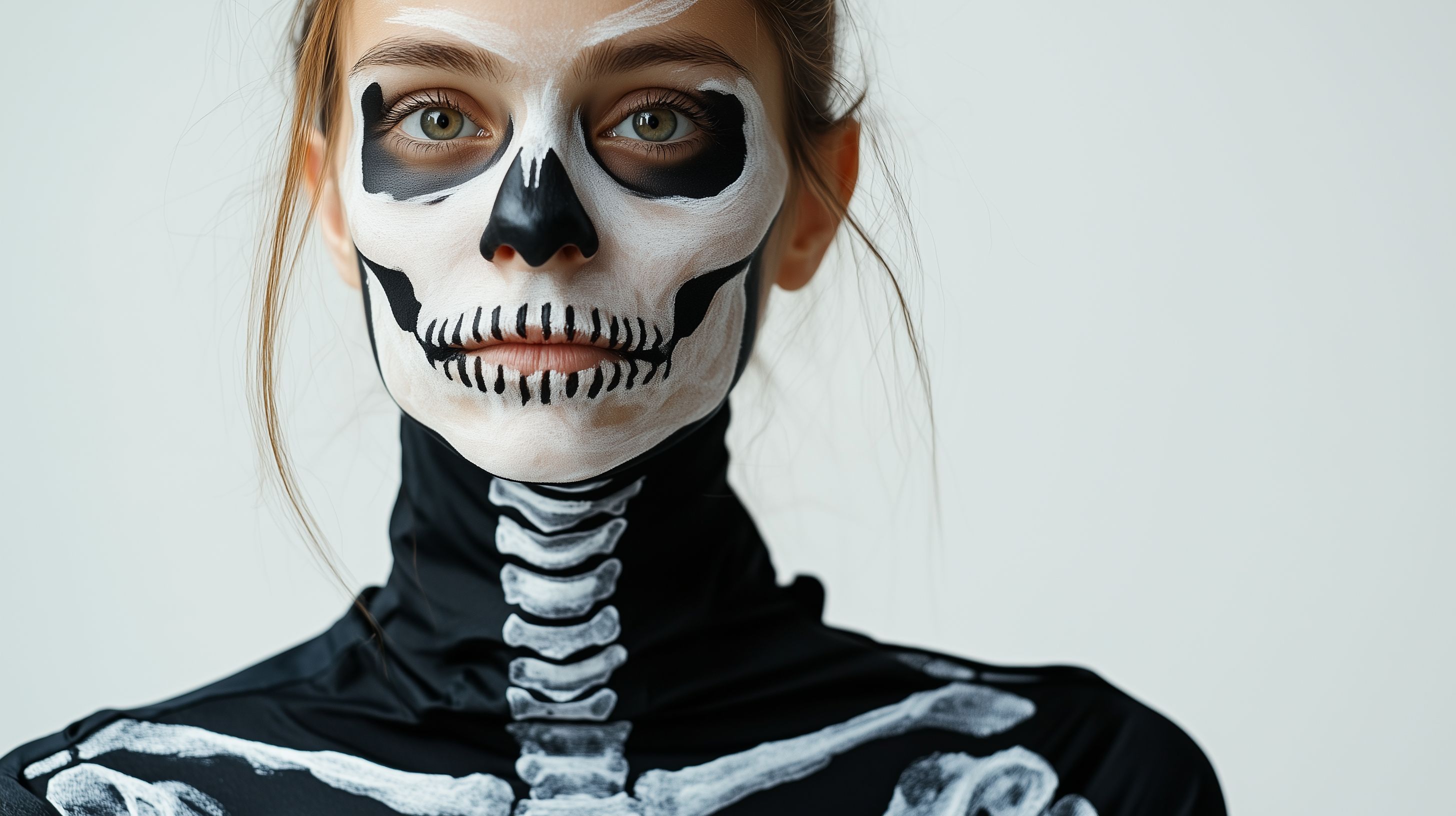 Das Bild zeigt eine Frau mit einem detaillierten Skelett-Kostüm und intensivem Gesichts-Make-up. Der ernsthafte Blick und die düstere, mystische Optik verleihen dem Foto eine gruselige, spannungsgeladene Atmosphäre. Das Bild eignet sich perfekt für Horror-Themen, Halloween-Dekorationen oder dramatische Porträt-Fotostrecken. Als hochauflösendes Stockfoto unter einer Creative-Commons-Lizenz bietet es viele Möglichkeiten für den Einsatz in Blogs, Newslettern, Social-Media-Kanälen oder Werbematerialien.