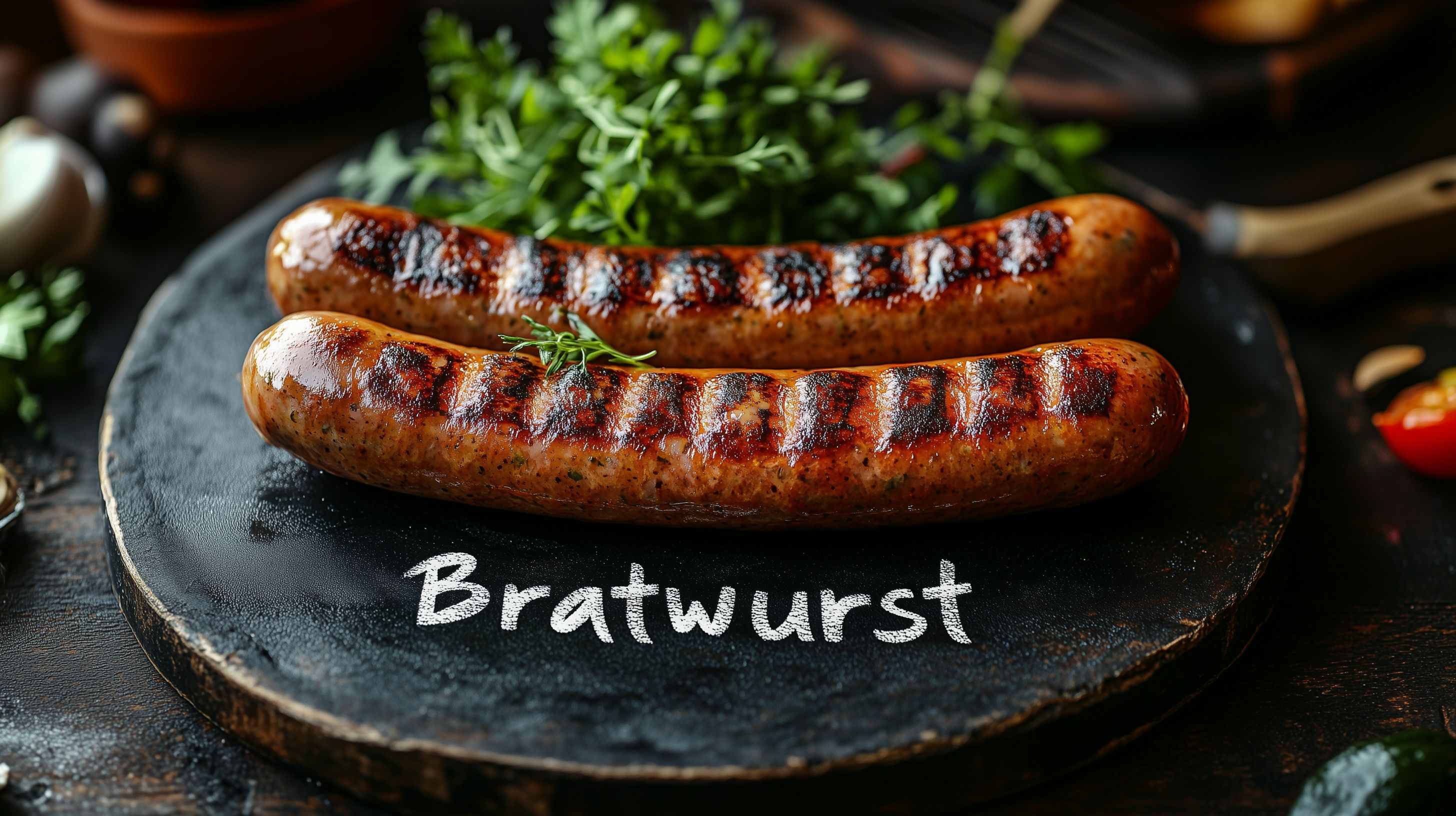 Dieses Foto zeigt zwei frisch gegrillte, aromatische Bratwürste, die auf einem rustikalen Holzteller serviert werden. Die Würste sind mit einer dunkelbraunen, glänzenden Kruste überzogen, die von einer leichten Rauchnote zeugt. Umrahmt werden sie von grünen Kräutern, die den appetitlichen Eindruck abrunden. Das Bild vermittelt eine Atmosphäre von Genuss und Gemütlichkeit, ideal für die Verwendung in Kochrezepten, Foodblogs oder Werbekampagnen rund um traditionelle deutsche Gerichte und Spezialitäten. Dieses hochauflösende Foto ist unter einer Creative-Commons-Lizenz kostenlos verfügbar.