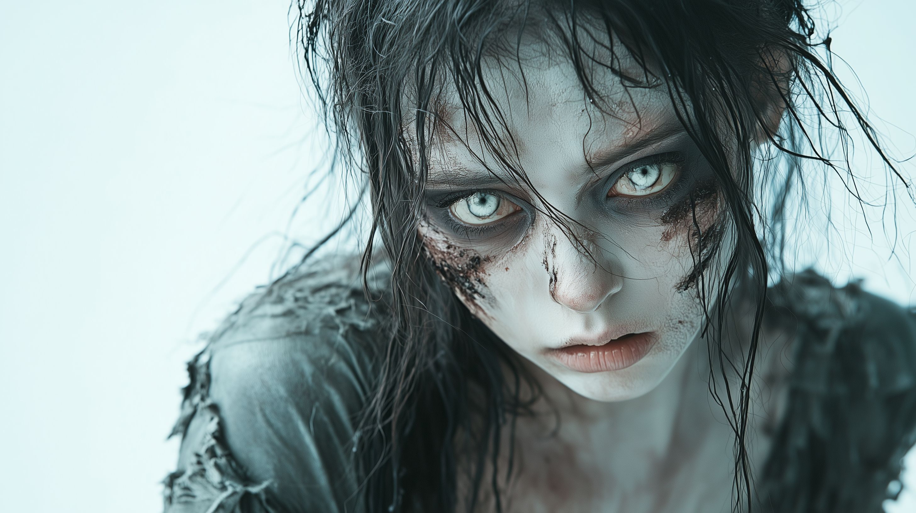 Das Foto zeigt das düstere Porträt einer jungen Frau, die wie eine Zombie-Figur aussieht. Ihr Gesicht ist verletzt und verschmutzt, ihre Haut blass und ihre Augen haben eine grünlich-blaue Färbung. Die schwarzen Haare fallen ihr wirr ins Gesicht, was dem Bild einen mystischen und bedrohlichen Charakter verleiht. Dieses Foto eignet sich hervorragend für den Einsatz in Beiträgen, Artikeln oder Werbematerialien mit Themen rund um Horror, Zombies oder den Gothic-Stil. Als kostenloses Stockfoto in hoher Auflösung und unter einer Creative-Commons-Lizenz kann es frei für verschiedenste Zwecke verwendet werden.