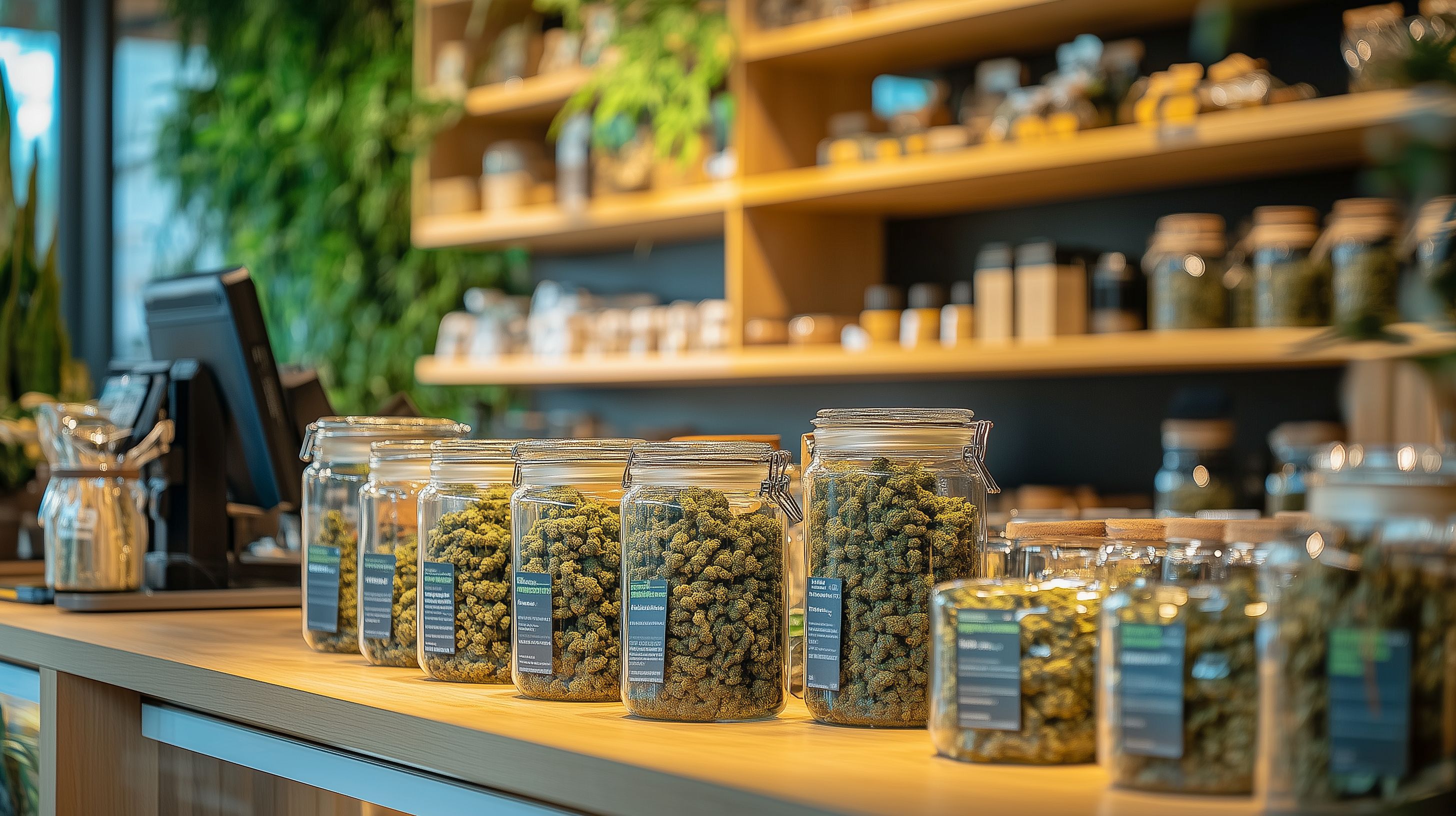 Dieses Foto zeigt eine Vielfalt an natürlichen Hanfprodukten in Glasbehältern, die auf einem Holzregal in einem Geschäft präsentiert werden. Das Regal befindet sich in einer warmen, gemütlichen Umgebung mit Grünpflanzen und einer modernen, aber natürlichen Einrichtung. Die verschiedenen Glasbehälter enthalten unterschiedliche Sorten und Formen von Hanfblüten, die für gesundheitliche und entspannende Anwendungen genutzt werden können. Dieses hochauflösende Stockfoto unter Creative Commons-Lizenz eignet sich hervorragend für die Verwendung in Blogbeiträgen, Newsletter-Kampagnen, Social-Media-Posts oder Werbemedien rund um das Thema Naturheilkunde, Alternativmedizin und Entspannung.