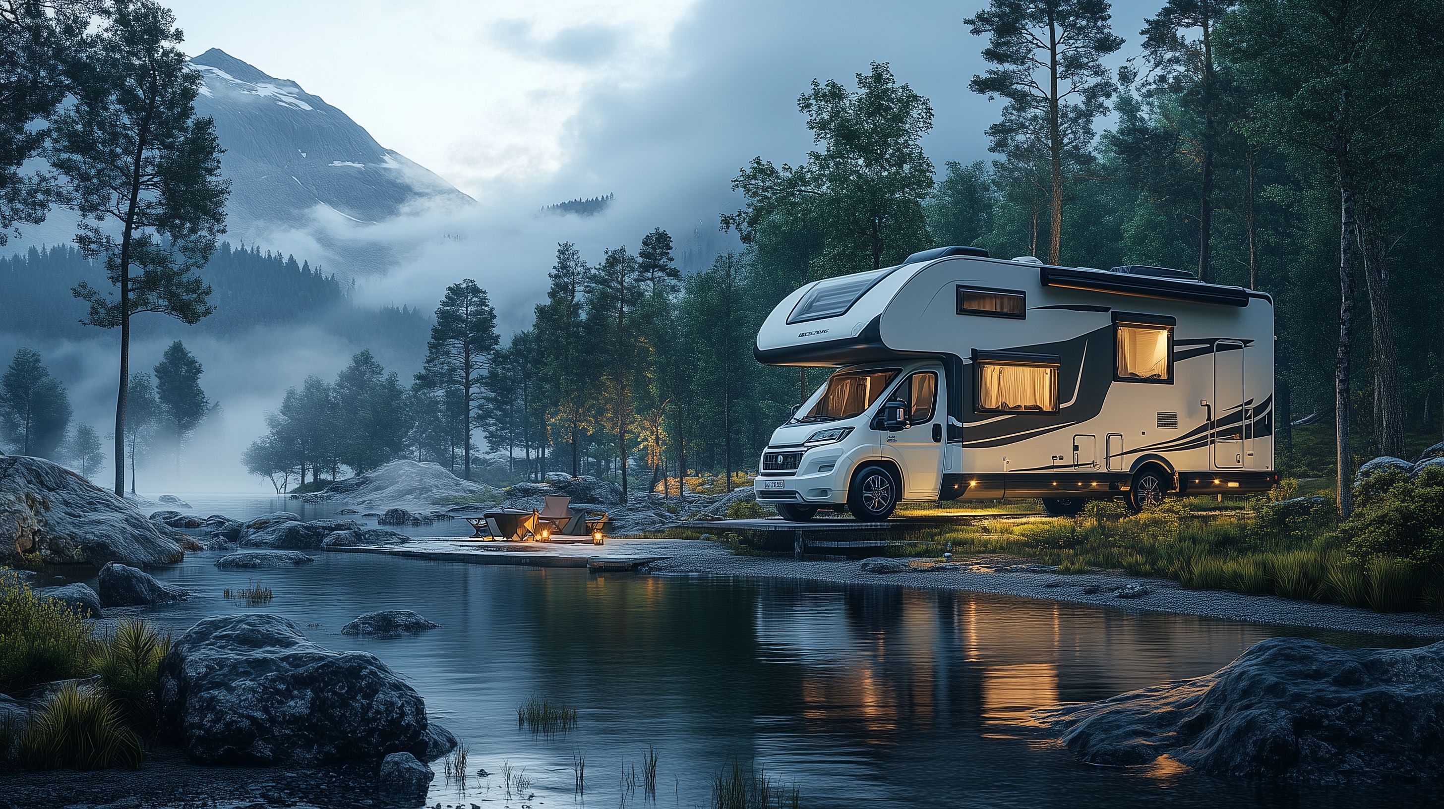 Das Foto zeigt ein modernes Wohnmobil, das an einem ruhigen See in einer malerischen Berglandschaft geparkt ist. Die Szene ist von einer stimmungsvollen Abendstimmung mit warmer Beleuchtung und Reflexionen im Wasser geprägt. Das Wohnmobil steht auf einem einfachen Holzbohlenweg, umgeben von hohen Bäumen und einem nebligen Bergmassiv im Hintergrund. Das Bild vermittelt Ruhe, Abenteuerlust und die Freiheit des Reisens in der Natur. Dieses Stockfoto in hoher Auflösung unter Creative-Commons-Lizenz eignet sich ideal für Blogbeiträge, Social-Media-Posts oder Werbematerial rund um Reisen, Camping und das Wohnmobilleben.