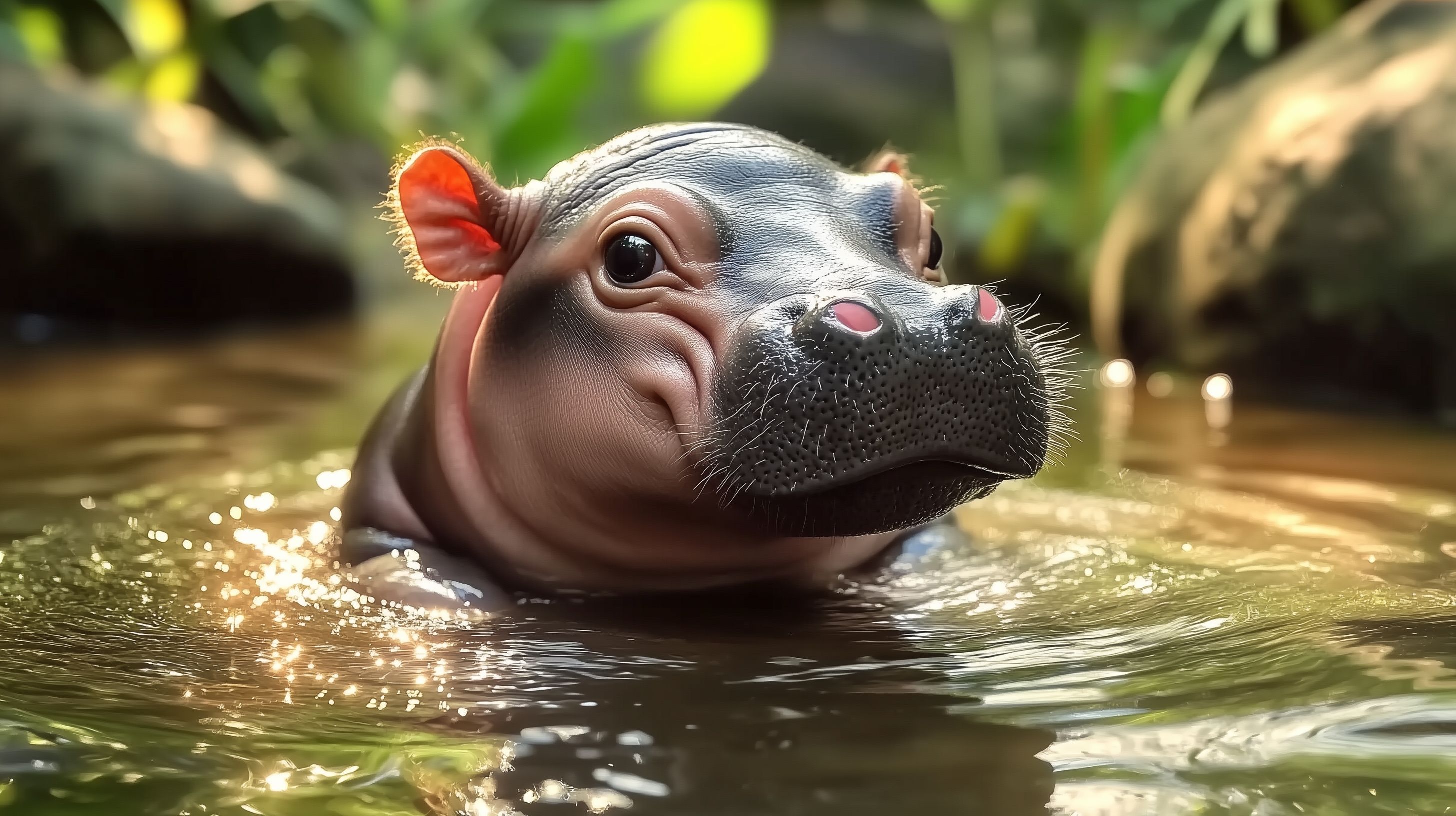 Dieses eindrucksvolle Foto zeigt ein verspieltes Zwergflusspferd, das in einem grünen, von Pflanzen umgebenen Gewässer auftaucht. Die Nahaufnahme bringt die detaillierten Gesichtszüge, die roten Ohren und den kräftigen Körper des Tieres besonders gut zur Geltung. Das Bild besticht durch die lebendige Farbgebung, den natürlichen Hintergrund und die gelungene Komposition. Es eignet sich hervorragend als hochauflösendes, kostenloses Stockfoto für Blogs, Soziale Medien, Newsletter oder Werbekampagnen mit Naturmotiven. Die Creative-Commons-Lizenz erlaubt eine vielseitige, uneingeschränkte Nutzung.