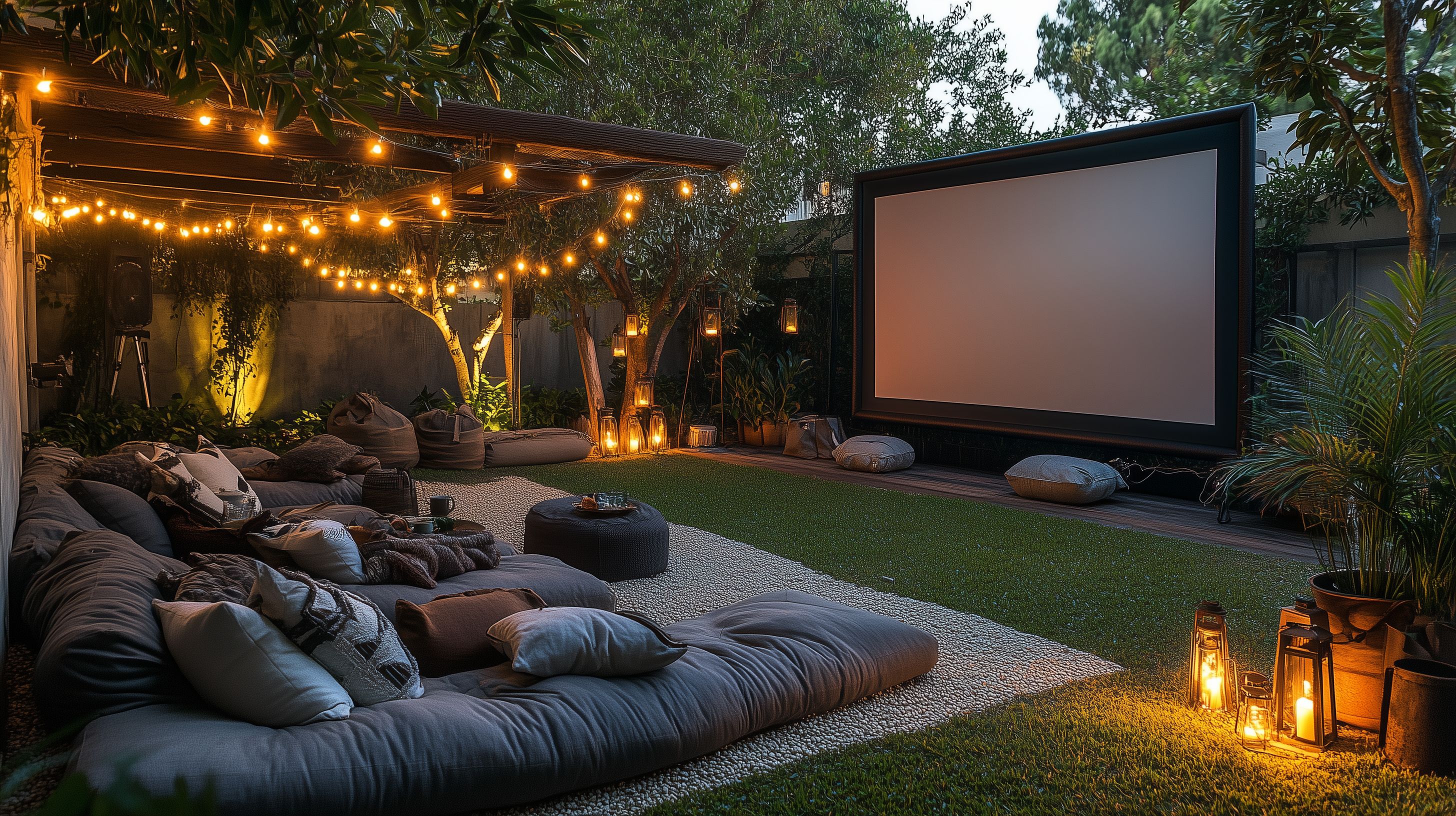 Dieses Foto zeigt ein gemütliches Outdoor-Kino-Setup, das in eine idyllische, tropische Gartenlandschaft eingebettet ist. Der große Projektionsbildschirm ist von einem Holzdach überspannt, das mit Lichterketten dekoriert ist und so eine wohlige Stimmung verbreitet. Gemütliche Polster und Kissen laden zum Relaxen ein, während die Umgebung mit Palmen und anderen exotischen Pflanzen eine tropische Atmosphäre schafft. Diese Szene wäre perfekt für sommerliche Filmabende, Gartenparties oder Grillabende im Freien geeignet. Als kostenloses Stockfoto in hoher Auflösung und unter Creative-Commons-Lizenz bietet dieses Bild viele Einsatzmöglichkeiten für Blogs, Social-Media-Posts oder Werbematerialien.