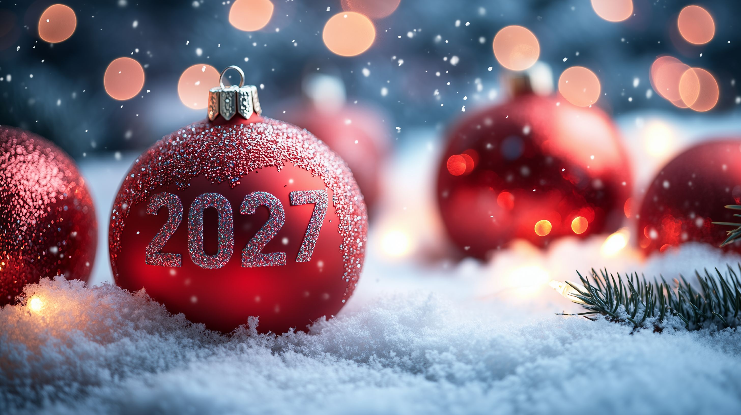 Dieses Bild zeigt eine Gruppe roter Weihnachtskugeln, die in einem Schneehaufen platziert sind. Auf den Kugeln ist die Jahreszahl 2027 zu sehen, was sie zu einem Symbol für den bevorstehenden Jahreswechsel macht. Das Bild ist von einem leuchtenden Hintergrund umgeben, der den Eindruck von Glitzer und funkelnden Lichtern erweckt, was eine festliche und feierliche Atmosphäre vermittelt. Dieses kostenloses Stockfoto in hoher Auflösung unter Creative-Commons-Lizenz eignet sich hervorragend für die Verwendung in Blogs, Newslettern, Social-Media-Beiträgen oder Werbematerialien rund um den Jahreswechsel und die Weihnachtszeit.