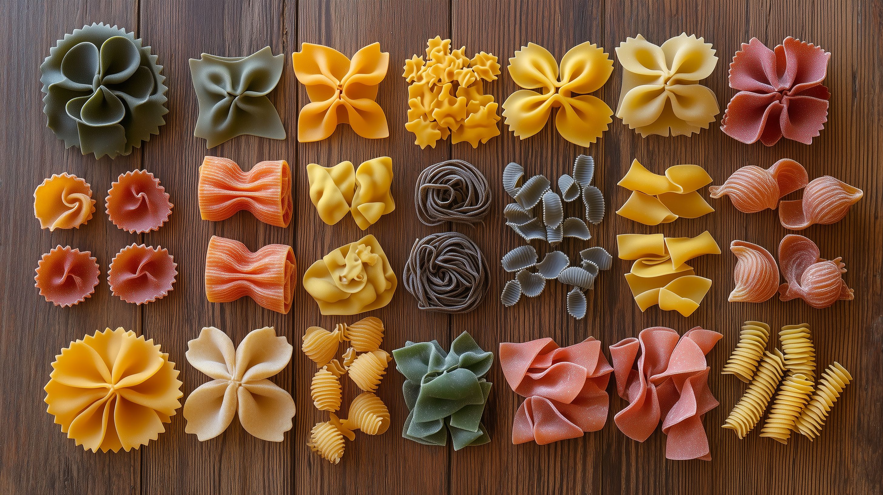 Dieses Bild zeigt eine vielfältige Anordnung von ungekochten Teigwaren in unterschiedlichen Farben und Formen auf einem rustikalen Holzhintergrund. Die Nudeln, Farfalle, Muschelnudeln und andere Pastasorten sind sorgfältig nebeneinander platziert, um eine harmonische Komposition zu schaffen. Die warmen Rottöne, Gelbtöne und Grüntöne der Teigwaren erzeugen eine lebendige und natürliche Optik. Dieses Foto eignet sich hervorragend als Hintergrund oder Gestaltungselement für Blogs, Newsletter, Social-Media-Beiträge oder Werbematerialien zum Thema Kochen, Ernährung oder italienische Küche. Als kostenloses Stockfoto in hoher Auflösung und unter einer Creative-Commons-Lizenz kann es vielfältig eingesetzt werden.