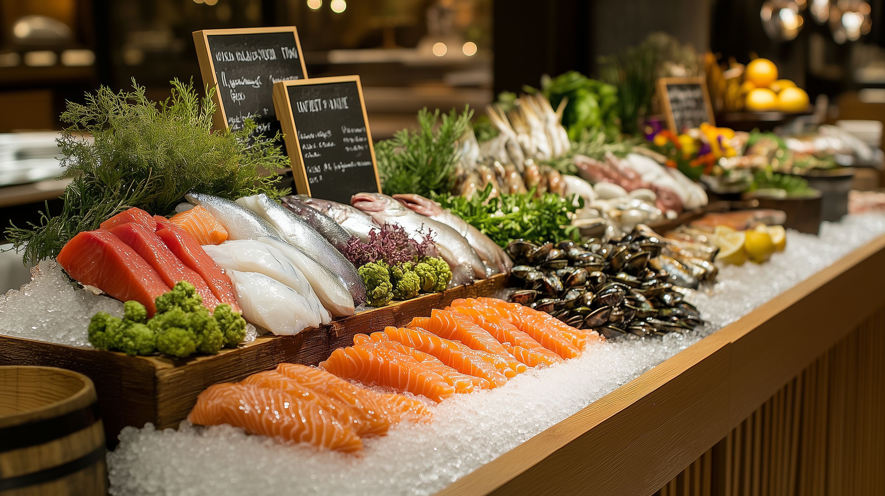 Das Bild zeigt eine Fischhändler-Theke mit einer vielfältigen Auswahl an frischen Meeresfrüchten und Fisch, wie Lachs, Garnelen und Austern. Die Waren sind auf Eis präsentiert, um ihre Frische zu bewahren. Schilder mit handgeschriebenen Beschreibungen und Preisen vervollständigen das Bild eines gut bestückten, hochwertig wirkenden Fischangebots. Diese Aufnahme eignet sich hervorragend als kostenloses Stockfoto für die Verwendung in Artikeln, Newslettern oder Social-Media-Kanälen zum Thema Gastronomie, Kochen und gehobene Küche. Die hohe Bildauflösung und Creative-Commons-Lizenzierung ermöglichen eine flexible Nutzung.
