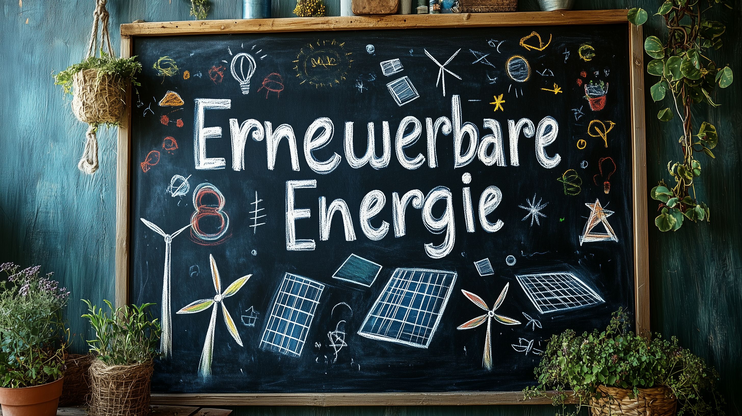 Das Bild zeigt eine Wandtafel in einem Klassenzimmer oder Lernraum, die mit verschiedenen Kreideskizzen und -zeichnungen zu erneuerbaren Energien dekoriert ist. Auf der Tafel sind Windräder, Solarpaneele, Glühbirnen und andere Symbole für Ökostrom und Nachhaltigkeit zu sehen. Das Arrangement vermittelt einen Eindruck von Kreativität, Inspiration und einem lehrreichen Umgang mit dem Thema der erneuerbaren Energien. Das Bild könnte als kostenloses Stockfoto für Blogbeiträge, Social-Media-Posts oder Werbematerialien zum Thema Umweltschutz, Bildung und ökologische Ressourcen genutzt werden. Die hochwertige Auflösung und die Creative-Commons-Lizenzierung machen es zu einer flexibel einsetzbaren, kostenlosen Bildressource.