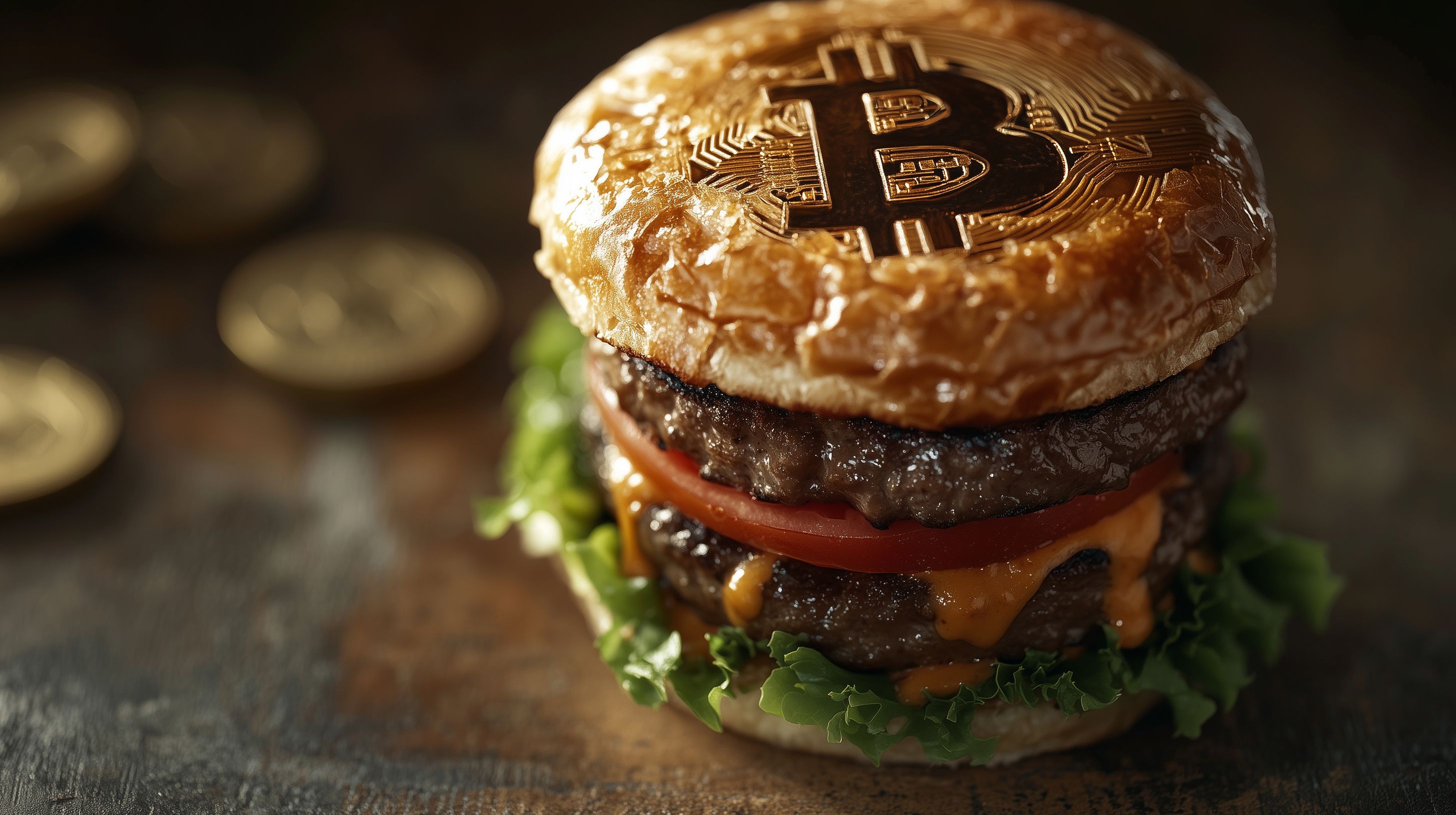 Leckerer Bitcoin-Burger auf rustikalem Holztisch von Marco Verch unter Creative Commons 2.0