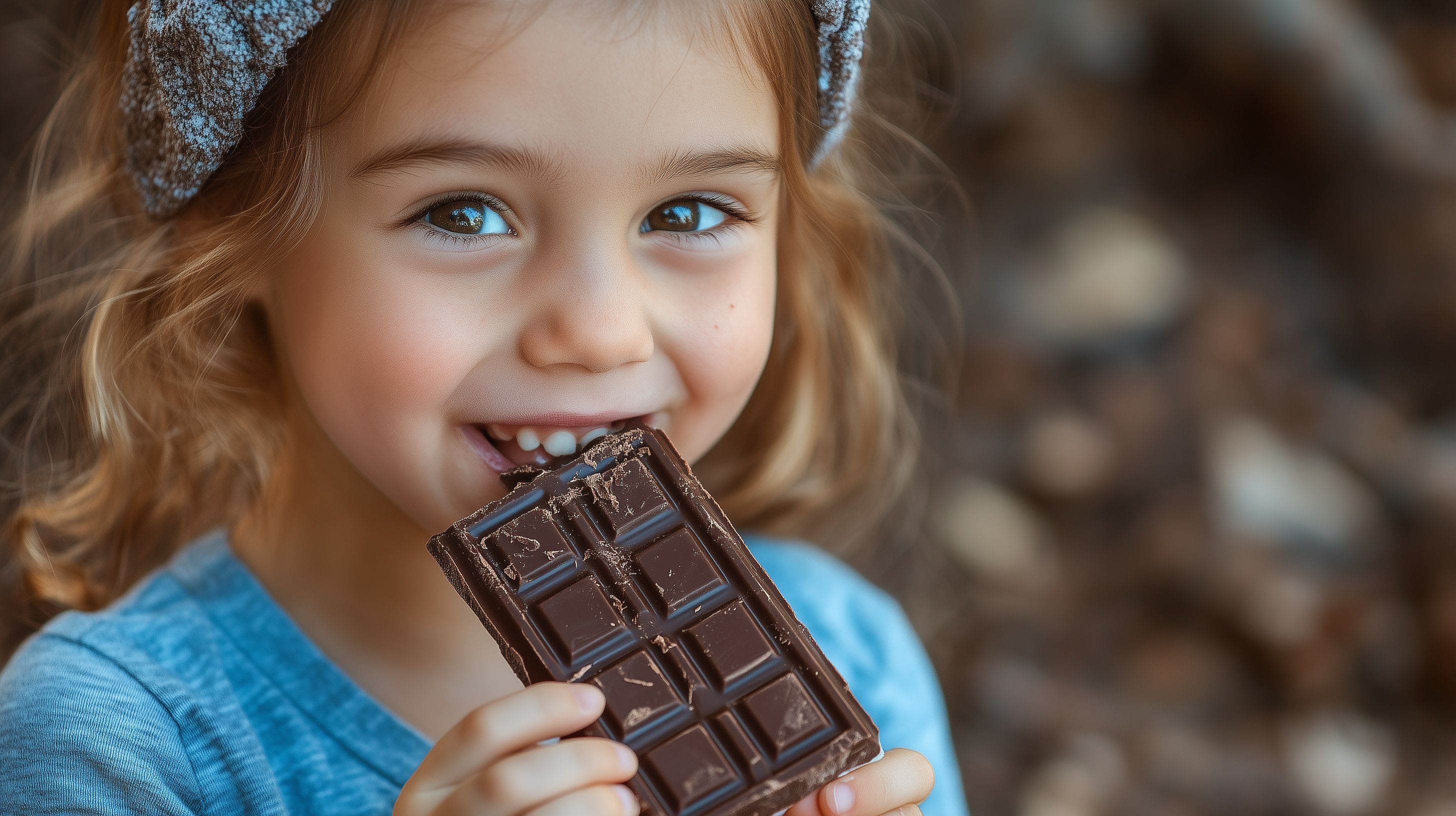 Das Bild zeigt ein glückliches, lächelndes Mädchen, das eine Tafel Schokolade genüsslich in den Mund steckt. Mit ihren strahlenden blauen Augen und dem verspielten, blonden Haar strahlt sie eine unbeschwerte Freude und Leichtigkeit aus. Die natürliche Umgebung im Hintergrund, die auf einen Herbsttag hindeutet, verleiht dem Motiv eine warme, harmonische Atmosphäre. Dieses kostenlose Stockfoto in hoher Auflösung unter Creative-Commons-Lizenz eignet sich perfekt für den Einsatz in Blogs, Newslettern, Social-Media-Beiträgen oder Werbematerialien, um Kinderfreude, Genuss und natürliche Schönheit zu vermitteln.