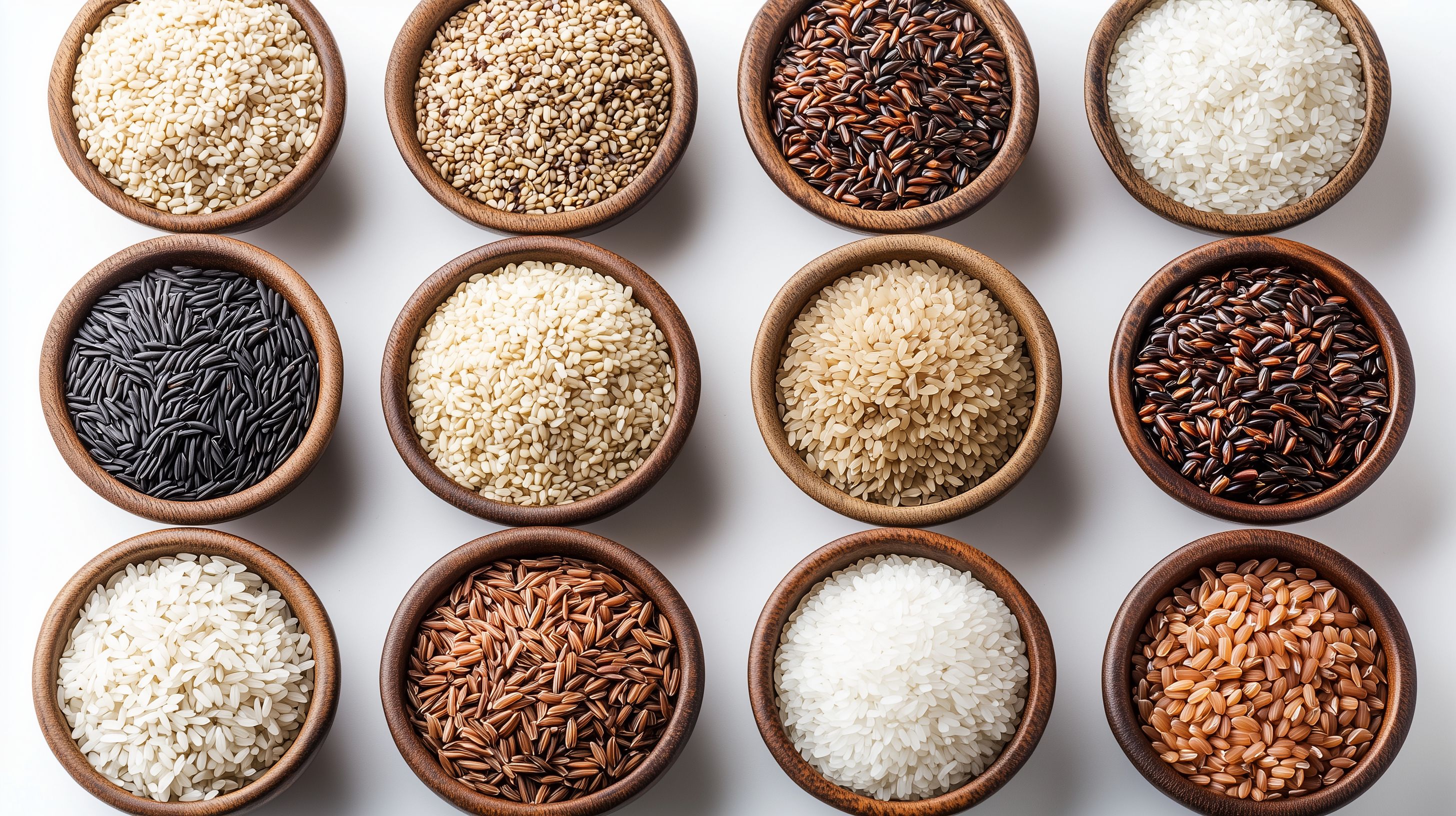 Dieses Foto zeigt eine Vielfalt an unterschiedlichen Reissorten präsentiert in hölzernen Schüsseln. Die Ansicht aus der Vogelperspektive ermöglicht einen umfassenden Blick auf das farbenfrohe Arrangement. Verschiedene Reisarten wie Wildreis, Brauner Reis, Basmati-Reis und Sushi-Reis sind hier nebeneinander angeordnet. Die rustikalen Holzschalen unterstreichen den natürlichen Charakter der Lebensmittel. Dieses kostenlose Stockfoto in hoher Auflösung unter Creative-Commons-Lizenz eignet sich hervorragend für Blogbeiträge, Newsletter-Designs oder Social-Media-Posts rund um das Thema gesunde und nachhaltige Ernährung.