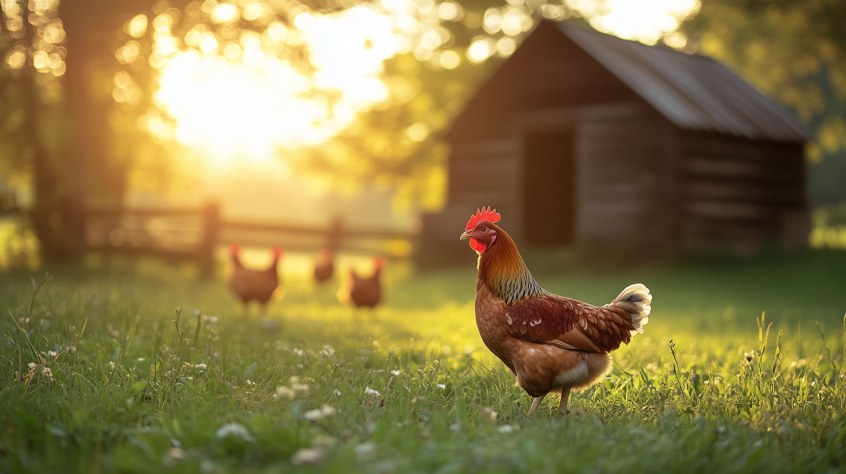 Das Bild zeigt eine idyllische Szene auf einem Bauernhof. In der Vordergrund sind zwei Freilaufhühner zu sehen, die über eine sonnendurchflutete Wiese mit Gänseblümchen laufen. Im Hintergrund ist ein hölzerner Hühnerstall zu erkennen, umgeben von Bäumen und einem Zaun. Die Atmosphäre ist friedlich und natürlich, geprägt von der warmen Ausstrahlung des Sonnenlichts. Dieses Bild bietet sich perfekt für den Einsatz in Blogs, Newslettern, Social-Media-Beiträgen oder Werbekampagnen an, die eine ländliche, ökologische und nachhaltige Thematik transportieren wollen. Das hochauflösende Foto steht unter einer Creative-Commons-Lizenz kostenlos zur Verfügung.