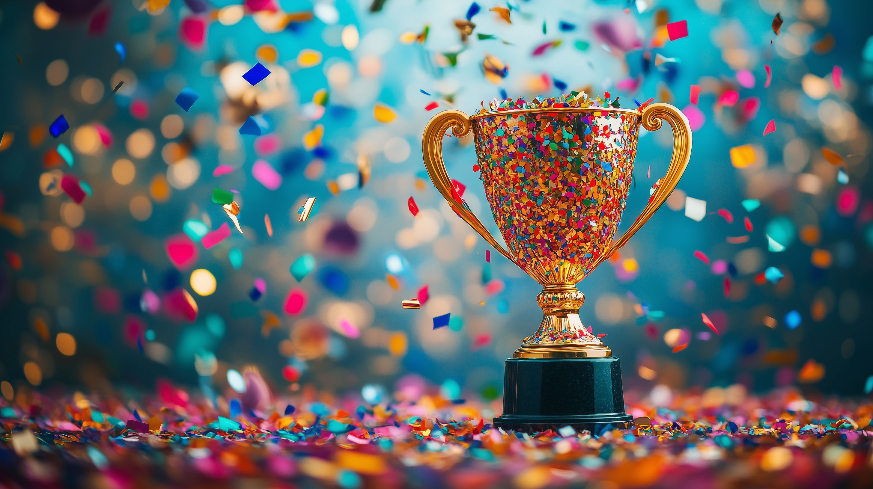 Glitzernde Siegerpokalitrophäe umgeben von bunten Konfetti von Marco Verch unter Creative Commons 2.0