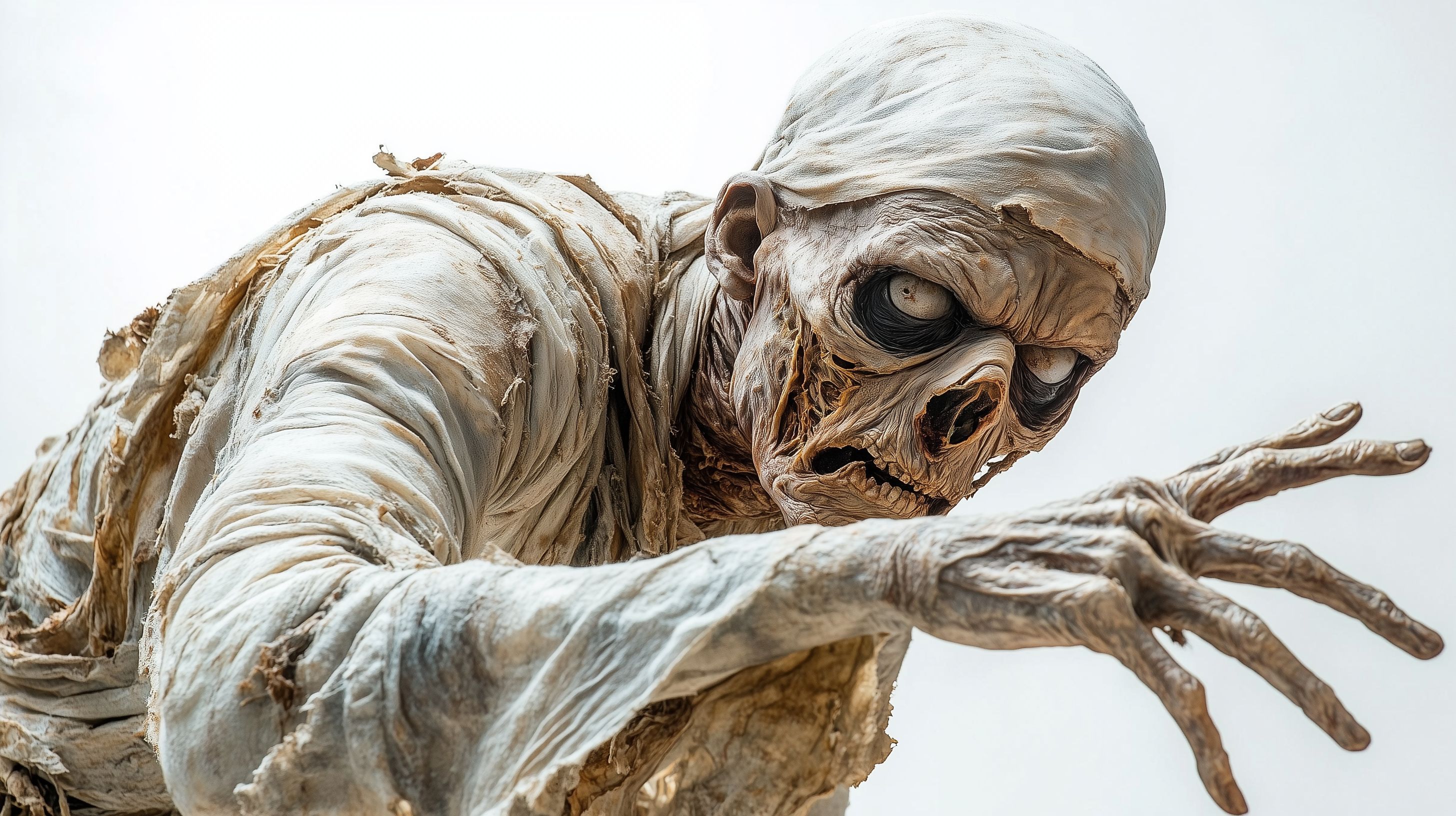 Dieses beeindruckende und detaillierte Fotomotiv zeigt eine realistisch dargestellte Mumien-Kreatur in einer bedrohlichen und gefährlichen Pose. Mit ihren verdrehten Gliedmaßen, den scharfen Zähnen und dem gruseligen Ausdruck im Gesicht strahlt sie eine starke Präsenz und Bedrohlichkeit aus. Das realistische 3D-Rendering und die authentischen Texturen verleihen der Szene eine einzigartige visuelle Wirkung, die ideal für Horrorfilm-Poster, Halloween-Dekorationen oder Promo-Materialien geeignet ist. Dieses Stockfoto ist in hoher Auflösung verfügbar und unter einer Creative-Commons-Lizenz nutzbar.