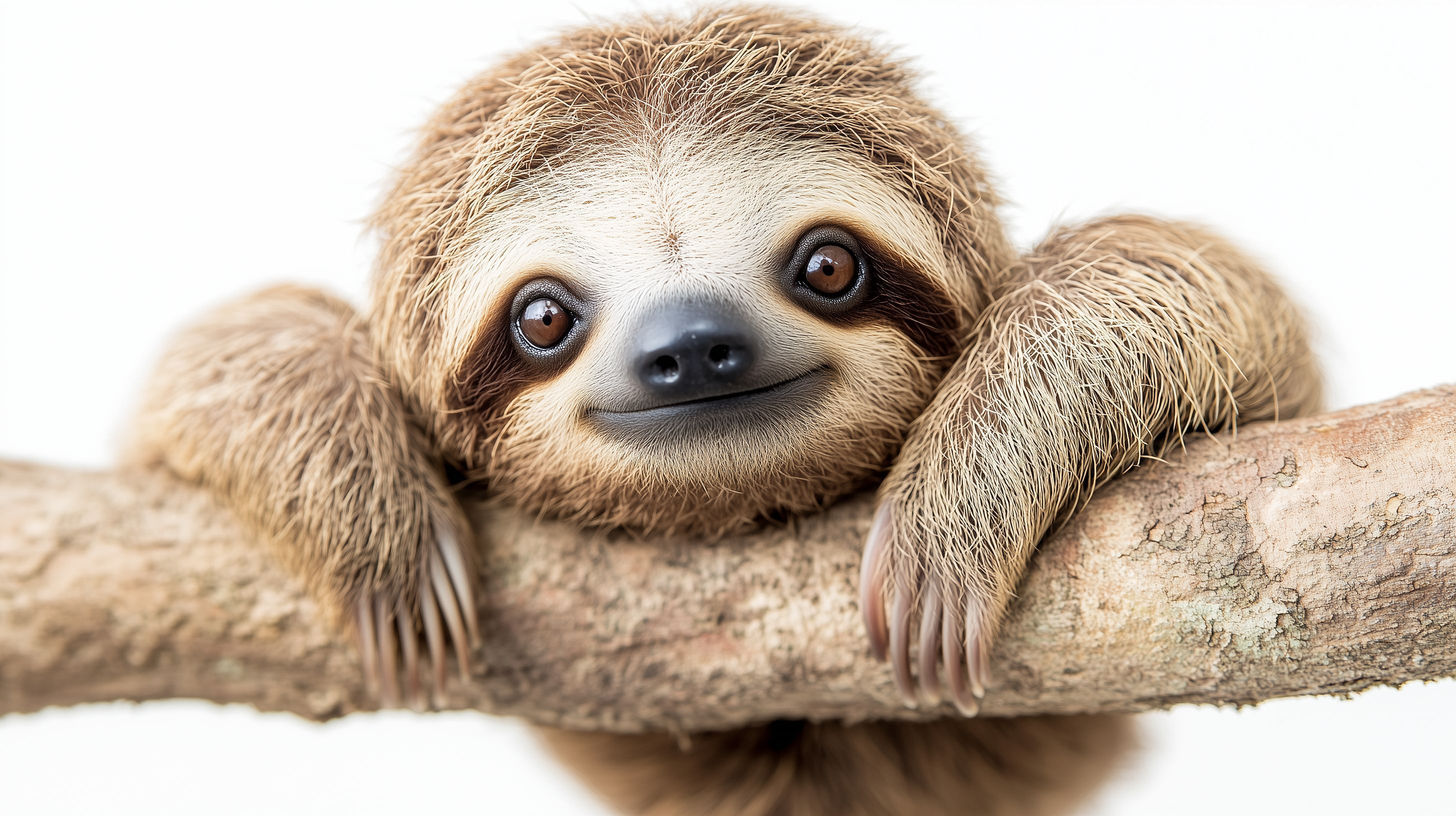 Dieses Bild zeigt ein äußerst süßes Faultier, das entspannt und verträumt von einem Ast hinunterschaut. Mit seinem struppigen braunen Fell, den großen dunklen Augen und dem friedlichen Gesichtsausdruck wirkt das Tier äußerst gemütlich und charmant. Das Foto wurde vor weißem Hintergrund aufgenommen, wodurch das Faultier optimal in Szene gesetzt wird. Das hochwertige, detailreiche Stockfoto eignet sich hervorragend für den Einsatz in Blogbeiträgen, Social-Media-Kanälen oder Werbematerialien. Es ist in hoher Auflösung und unter einer Creative-Commons-Lizenz verfügbar, sodass es kostenlos und flexibel genutzt werden kann.