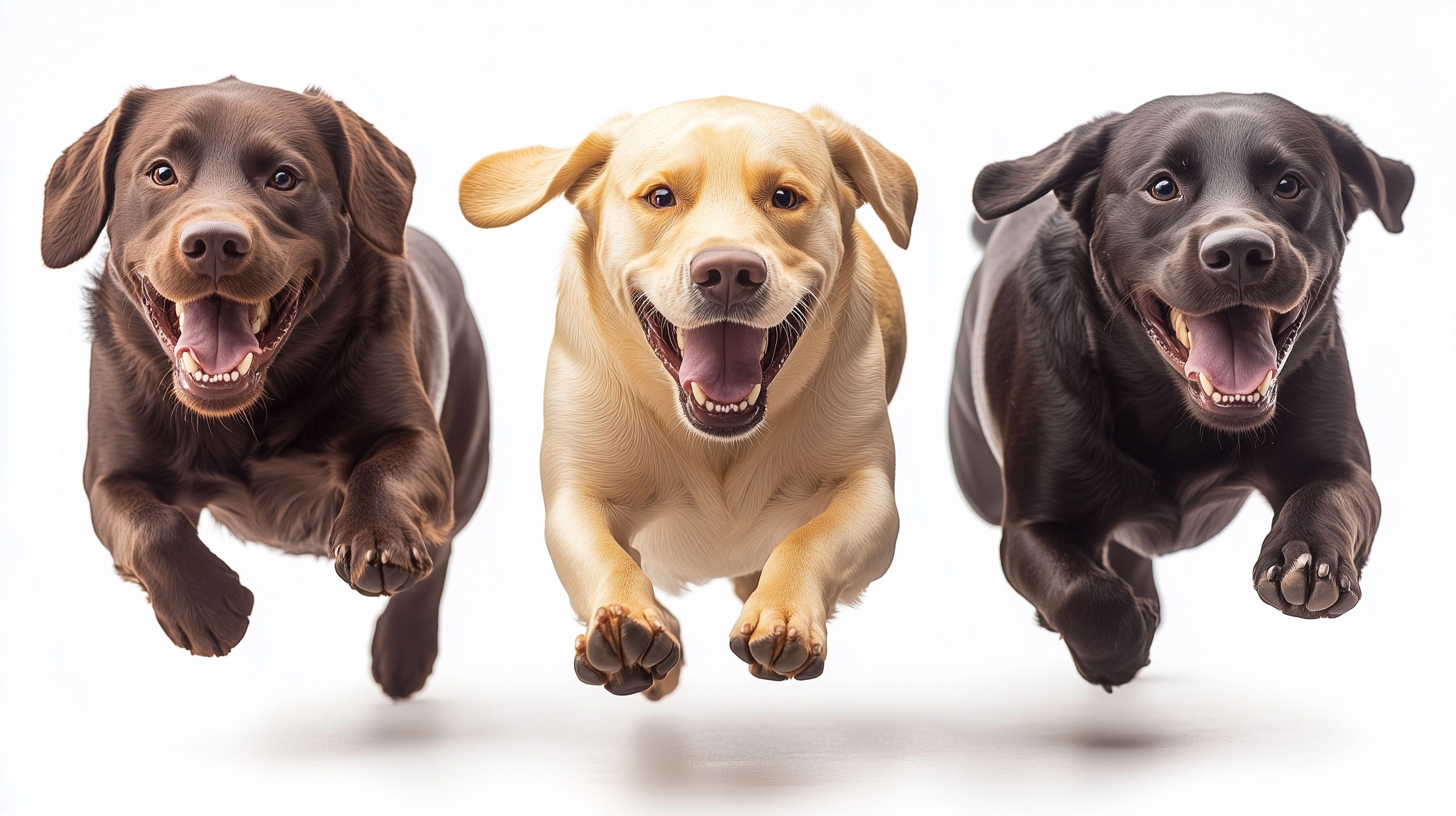 Das Bild zeigt drei fröhliche Labrador Retriever, die in einer dynamischen Sprungaktion dargestellt sind. Die Hunde haben unterschiedliche Fellfarben - braun, schwarz und beige - und strahlen Energie und Spielfreude aus. Die natürliche, freistehende Aufnahme mit weißem Hintergrund lässt die Vitalität und Lebendigkeit der Tiere besonders gut zur Geltung kommen. Dieses hochauflösende Stockfoto in hervorragender Qualität eignet sich hervorragend für den Einsatz in Blogs, Newslettern, Social-Media-Posts oder Werbematerialien rund um Tiere, Haustiere, Fotografie und Bewegung. Es steht unter einer Creative-Commons-Lizenz kostenlos für private und kommerzielle Zwecke zur Verfügung.