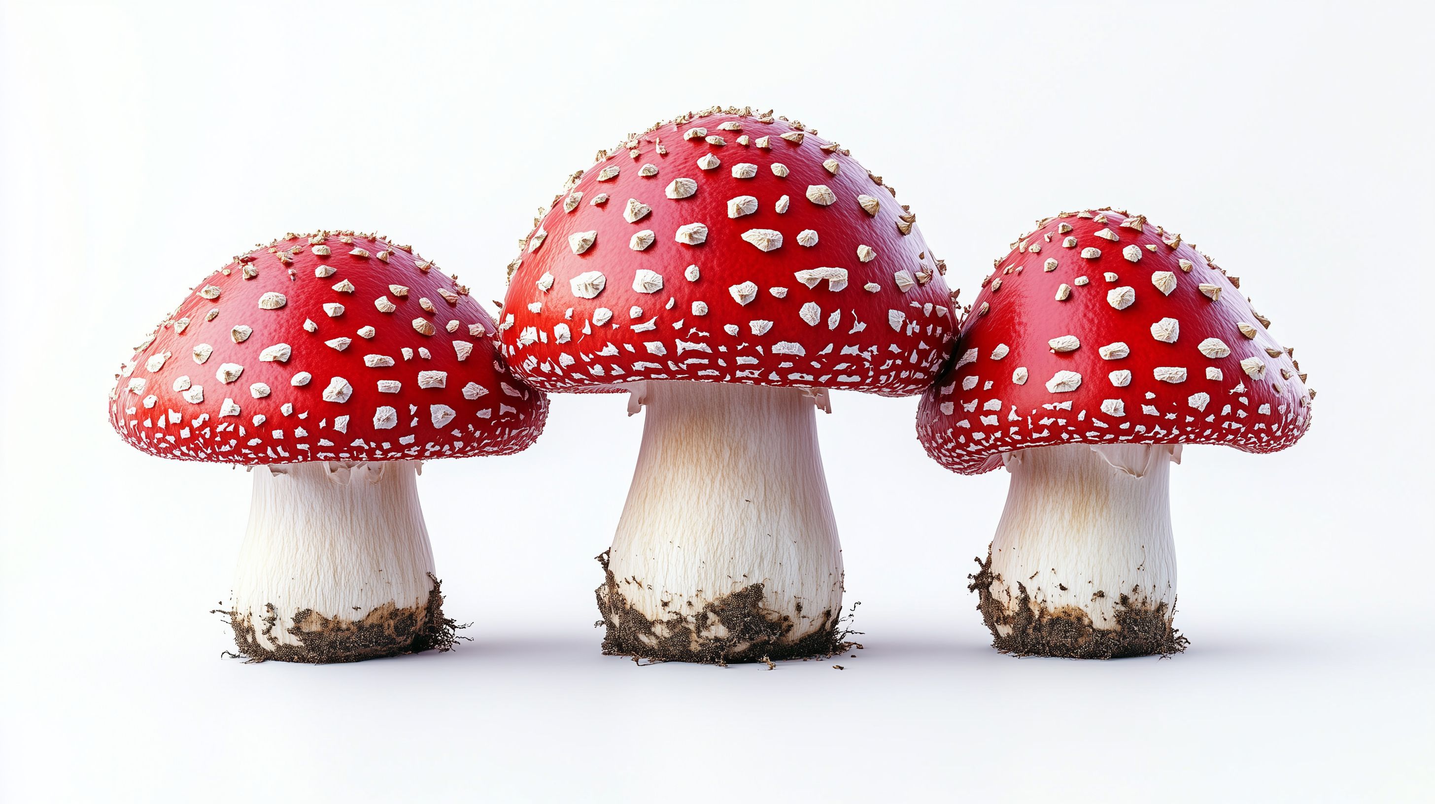 Das Bild zeigt drei auffällige rote Fliegenpilze mit weißen Punkten auf ihren Kappen, die auf Holzstämmen wachsen. Diese charakteristischen Pilze sind ein beliebtes Motiv in der Naturkunde-Fotografie. Die scharfe Fokussierung und die schlichte weiße Hintergrundgestaltung lenken den Blick ganz auf die detailreichen Strukturen der Pilze. Dieses hochwertige Stockfoto eignet sich hervorragend für Beiträge in Blogs, Newsletter oder Social Media-Kanälen rund um Natur, Botanik oder Pilzkunde. Es steht in hoher Auflösung unter einer Creative Commons-Lizenz zur Verfügung.