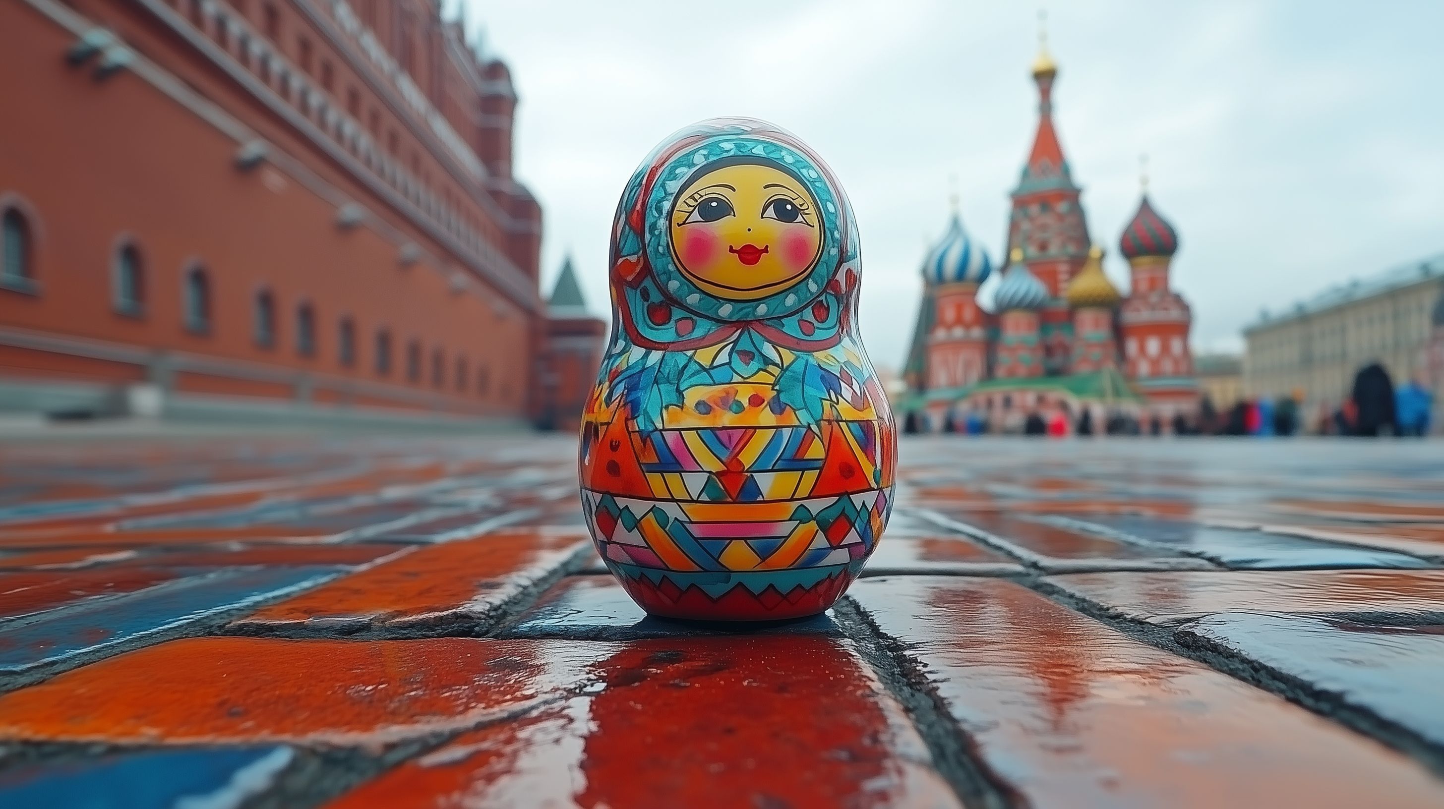 Dieses farbenfrohe Stockfoto zeigt eine traditionelle russische Matroschka-Puppe im Vordergrund, vor der imposanten Kulisse der Kreml-Kathedrale auf dem Roten Platz in Moskau. Die detailreich bemalte Holzpuppe dominiert das Bild mit ihren leuchtenden Farben und traditionellen Mustern. Der nasse Kopfsteinpflaster-Boden und die unscharfen Passanten im Hintergrund verleihen dem Bild eine stimmungsvolle Atmosphäre. Dieses kostenlose Stockfoto eignet sich perfekt für Reise-, Tourismus- oder Folklorebeiträge in Blogs, Newslettern oder Social-Media-Kanälen und ist in hoher Auflösung unter Creative-Commons-Lizenz verfügbar.