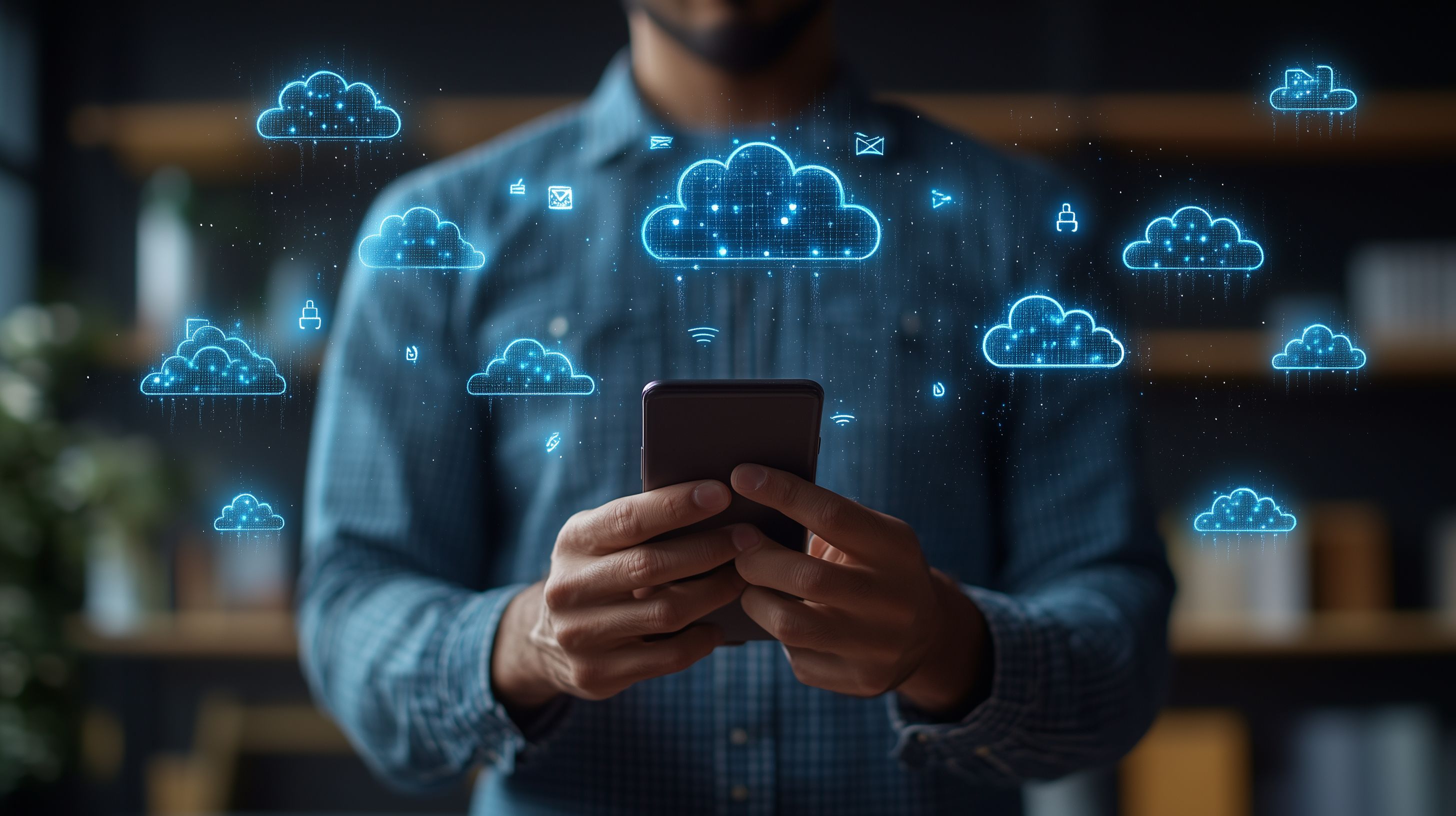 Das Foto zeigt einen Geschäftsmann, der ein Smartphone in der Hand hält. Auf dem Bildschirm sind leuchtende Wolkensymbole zu sehen, die eine digitale, vernetzte Welt symbolisieren. Die Szene vermittelt den Eindruck einer modernen, technologiegetriebenen Arbeitswelt, in der Datentransfer und Cloud-Computing eine zentrale Rolle spielen.