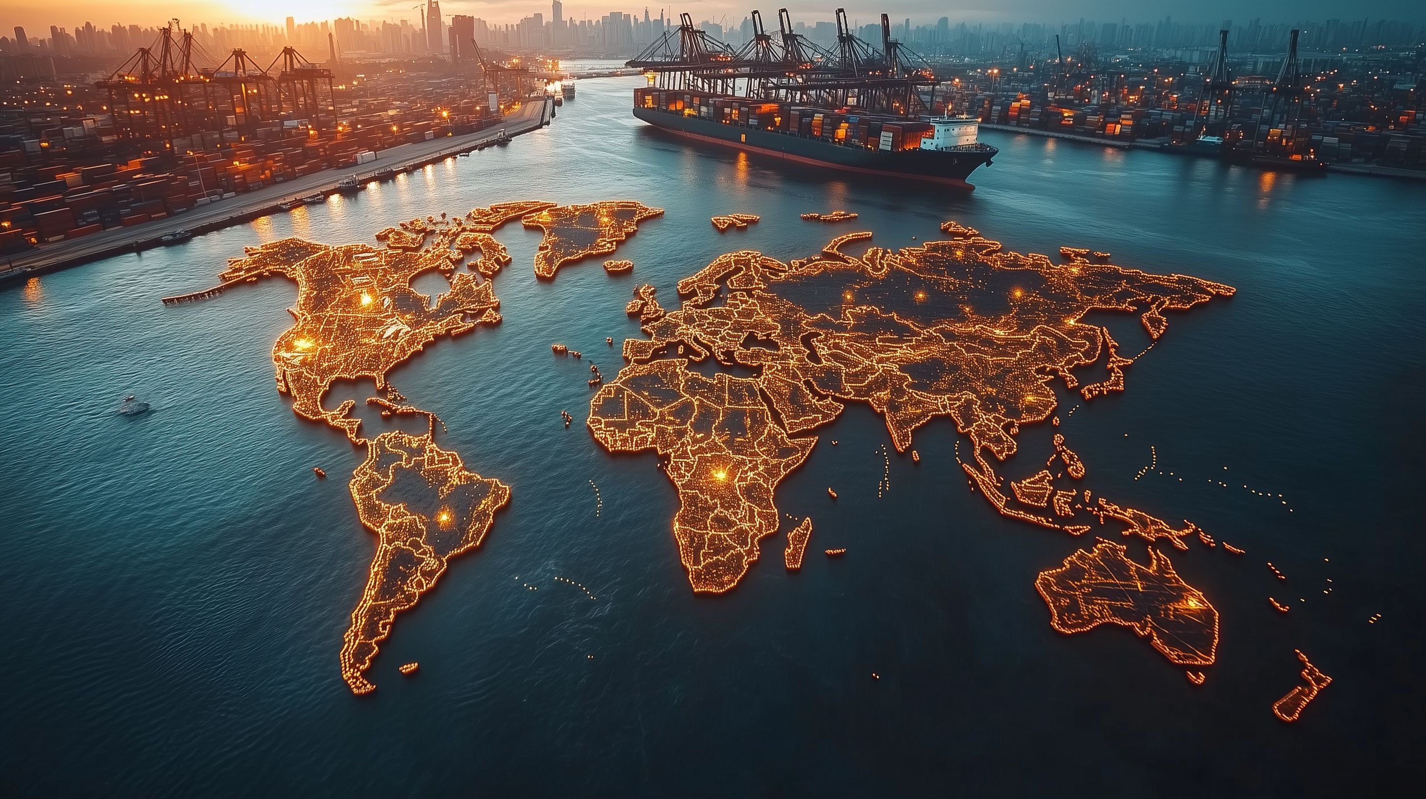 Das Bild zeigt eine faszinierende Luftaufnahme eines Containerhafens bei Sonnenuntergang. Im Vordergrund ist eine leuchtende Weltkarte zu sehen, deren Konturen sich über das dunkle Wasser erstrecken. Im Hintergrund ragen die Silhouetten der Hochhäuser einer modernen Großstadt empor, während mehrere riesige Frachtschiffe im Hafen vertäut sind. Die bunte Beleuchtung und die dramatischen Farben des Himmels verleihen der Szene eine beinahe surreale Atmosphäre und unterstreichen die globale Vernetzung und den Handel, der hier stattfindet. Dieses hochauflösende Foto eignet sich hervorragend als kostenloses Stockfoto für Blogs, Newsletter, Werbung und Social-Media-Kanäle, die das Thema Logistik, Globalisierung oder internationale Zusammenarbeit behandeln.