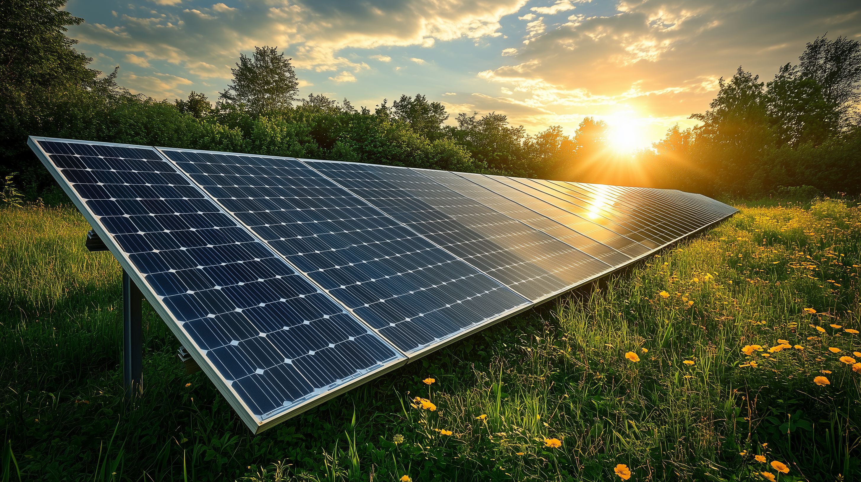 Dieses atemberaubende Foto zeigt eine Reihe von Solarmodulen, die auf einer grünen Wiese bei Sonnenuntergang aufgestellt sind. Die Solarenergie-Anlage steht inmitten einer idyllischen Landschaft mit Bäumen und einem dramatischen Himmel, der in warmen Orangetönen erstrahlt. Das Bild vermittelt den Eindruck von Nachhaltigkeit, Effizienz und der Nutzung erneuerbarer Energien in einer natürlichen Umgebung. Dieses hochauflösende Stockfoto ist perfekt für die Verwendung in Blogs, Newslettern, Social-Media-Posts oder Werbematerialien zum Thema Erneuerbare Energien, Umweltschutz und ökologische Verantwortung. Es steht unter einer Creative-Commons-Lizenz zur kostenlosen Nutzung zur Verfügung.
