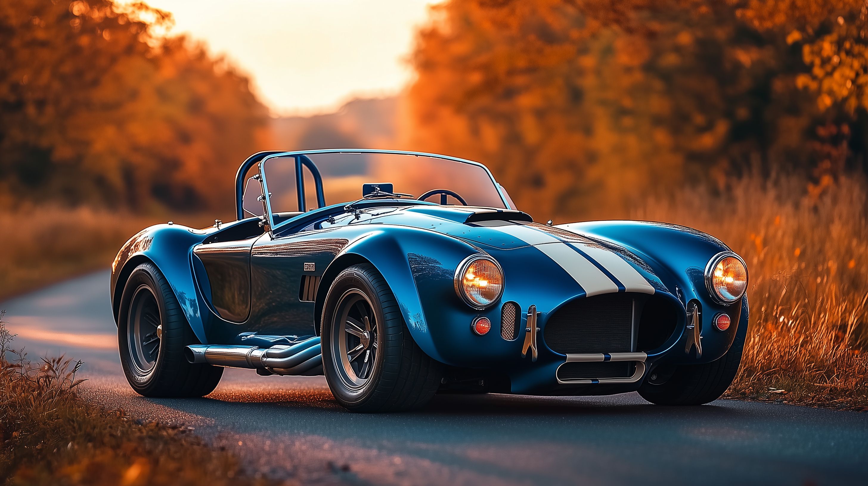 Dieses beeindruckende Foto zeigt einen klassischen blauen Sportwagen-Roadster, der auf einer idyllischen Landstraße im Sonnenuntergang fährt. Der Wagen mit seinen markanten Konturen und dem charakteristischen Shelby-Design sticht vor der malerischen herbstlichen Kulisse mit roten Bäumen und der warmen Abenddämmerung klar hervor. Das Foto vermittelt eine Stimmung von Abenteuer, Freiheit und Leidenschaft für Geschwindigkeit und Mobilität. Es eignet sich perfekt als hochwertiges Hintergrundbild für Blogbeiträge, Werbekampagnen oder Social-Media-Posts rund um Automobile, Vintage-Klassiker oder Lifestyle-Themen. Als kostenloses Stockfoto in hoher Auflösung und unter Creative-Commons-Lizenz ist es frei für viele kommerzielle und private Nutzungen verfügbar.