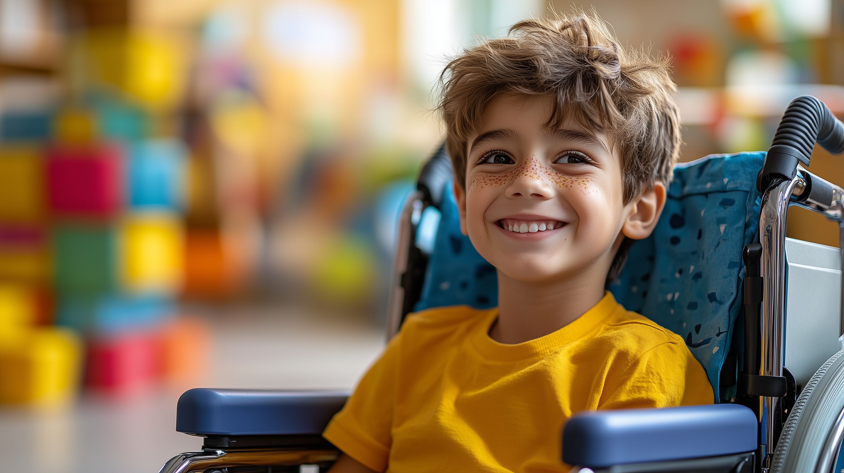 Das Foto zeigt einen fröhlich lächelnden Jungen in einem bunten, abwechslungsreichen Umfeld. Er sitzt in einem Rollstuhl und strahlt eine unbeschwerte, positive Stimmung aus. Die farbenfrohe Umgebung mit unterschiedlichen Objekten und Formen schafft eine einladende, lebendige Atmosphäre, die Inklusion und Teilhabe symbolisiert. Dieses Stockfoto in hoher Auflösung eignet sich hervorragend für Artikel, Blogbeiträge oder Social-Media-Postings zu Themen wie Behinderung, Barrierefreiheit und Gleichberechtigung. Es vermittelt auf natürliche Weise einen inklusiven, wertschätzenden Blick auf Menschen mit Einschränkungen. Das Bild steht unter einer Creative-Commons-Lizenz zur kostenlosen Nutzung zur Verfügung.