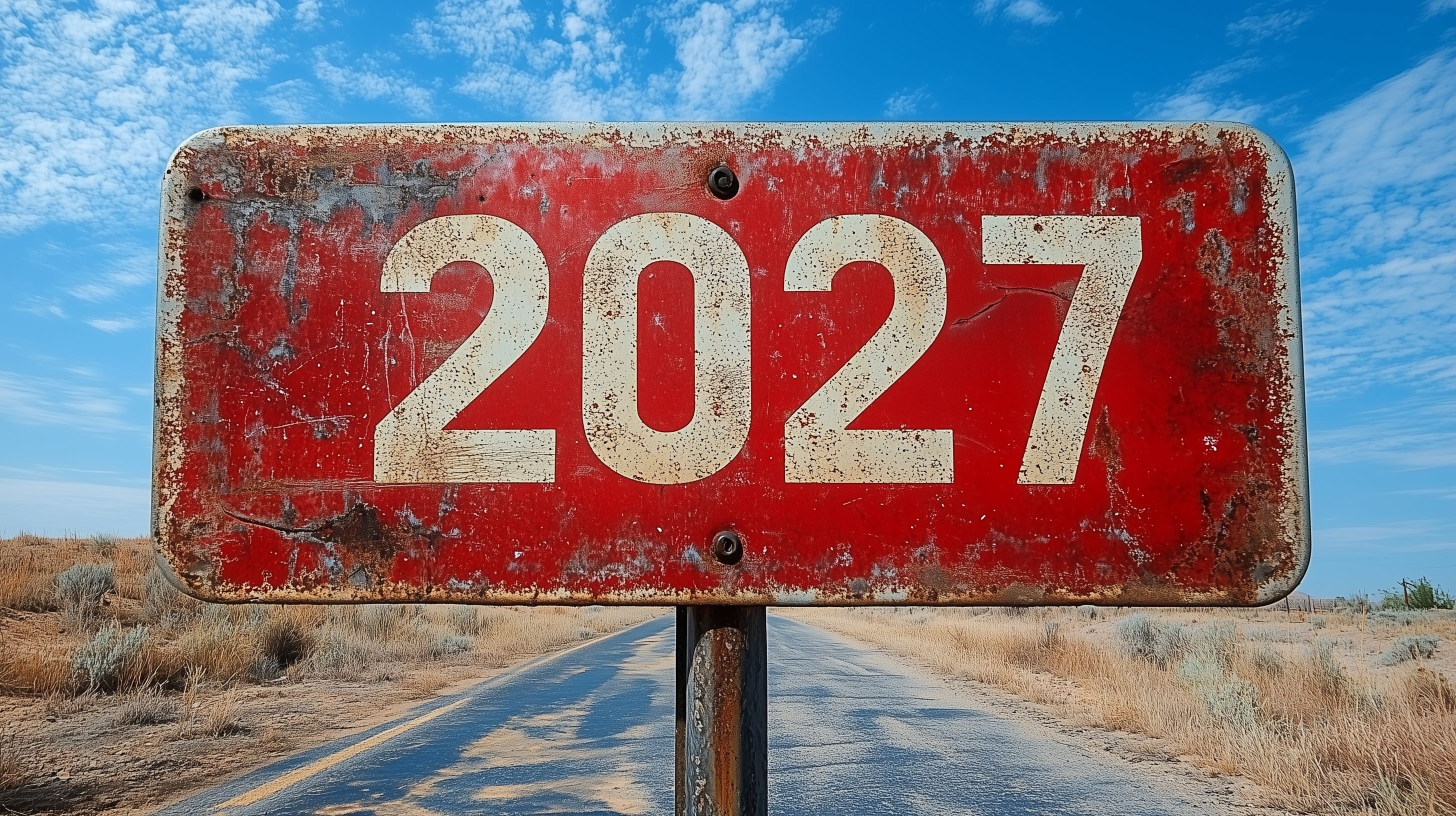 Das Foto zeigt ein altes, stark verwittertes rotes Metallschild mit der Aufschrift '2027' an einer Landstraße. Das Schild ist mit Rost und Farbabplatzungen übersät, was ihm einen rustikalen, vintage-artigen Charm verleiht. Im Hintergrund erstreckt sich eine weite, trockene Wüstenlandschaft unter einem strahlend blauen Himmel mit vereinzelten Wolken. Dieses Foto eignet sich hervorragend als kostenloses Stockfoto für Blogs, Newsletter, Social Media-Posts oder Werbematerialien mit einem authentischen, nostalgischen Look. Es steht unter einer Creative-Commons-Lizenz und ist in hoher Auflösung verfügbar.